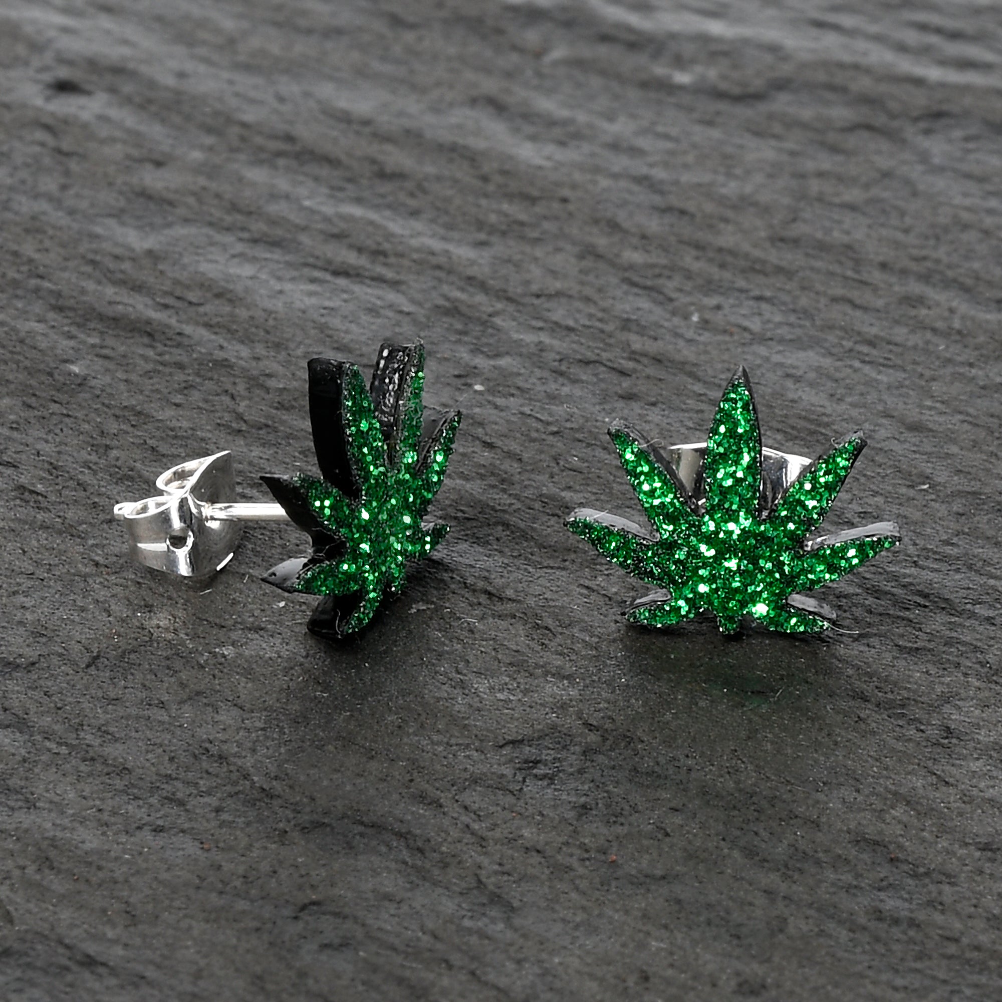 Green Glitter Marijuana Pot Leaf Stud Earrings