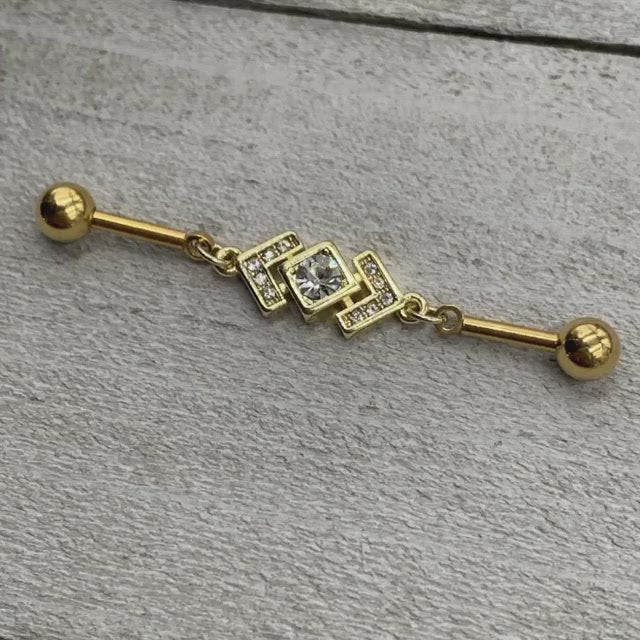 14 Gauge Clear Gem Gold Tone Geometric Dangle Industrial Barbell 38mm