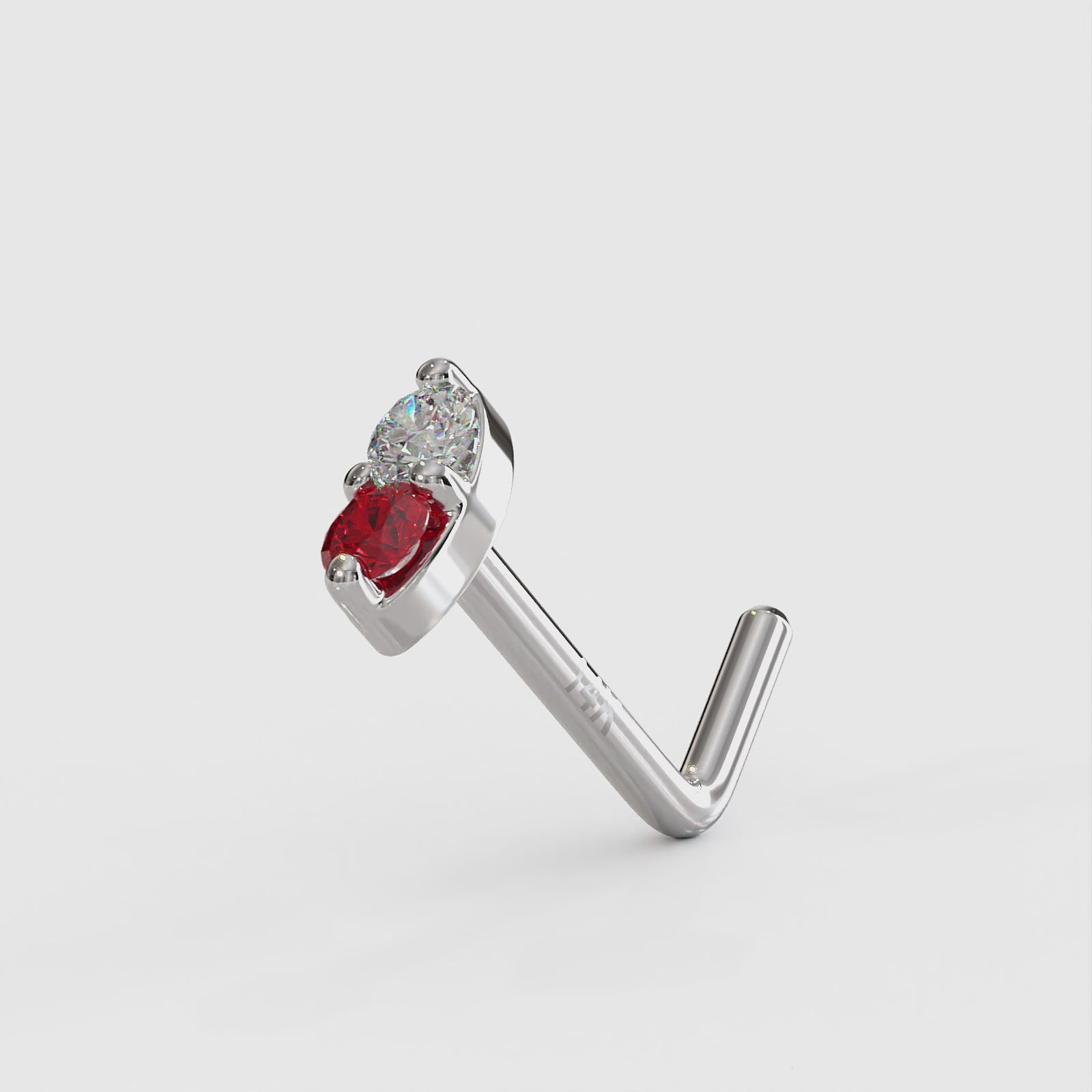 Solid gold double marquise cubic zirconia nose ring. Artisan handmade 14kt white gold nose ring withwith one prong-set diamond and genuine ruby stone. Made in the USA factory direct.