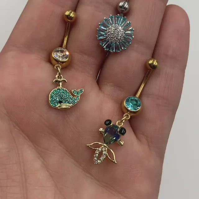 This frisky fish looks delighted to dangle from this 14 gauge navel ring! It's made with a 3/8" gold tone plated over 316L surgical grade stainless steel curved barbell with a 5mm top ball end. The bottom ball end is 8mm and set with a large aqua gem. Dangling beneath it is a fish charm with an aqua gem body and large black eyes. The fish's tail is done in an openwork style, with the center set with clear gems. It also features gold-tone detailing for a cohesive appearance. This whimsical water-dweller is sure to delight with this cheerful, nautical, navel jewelry!