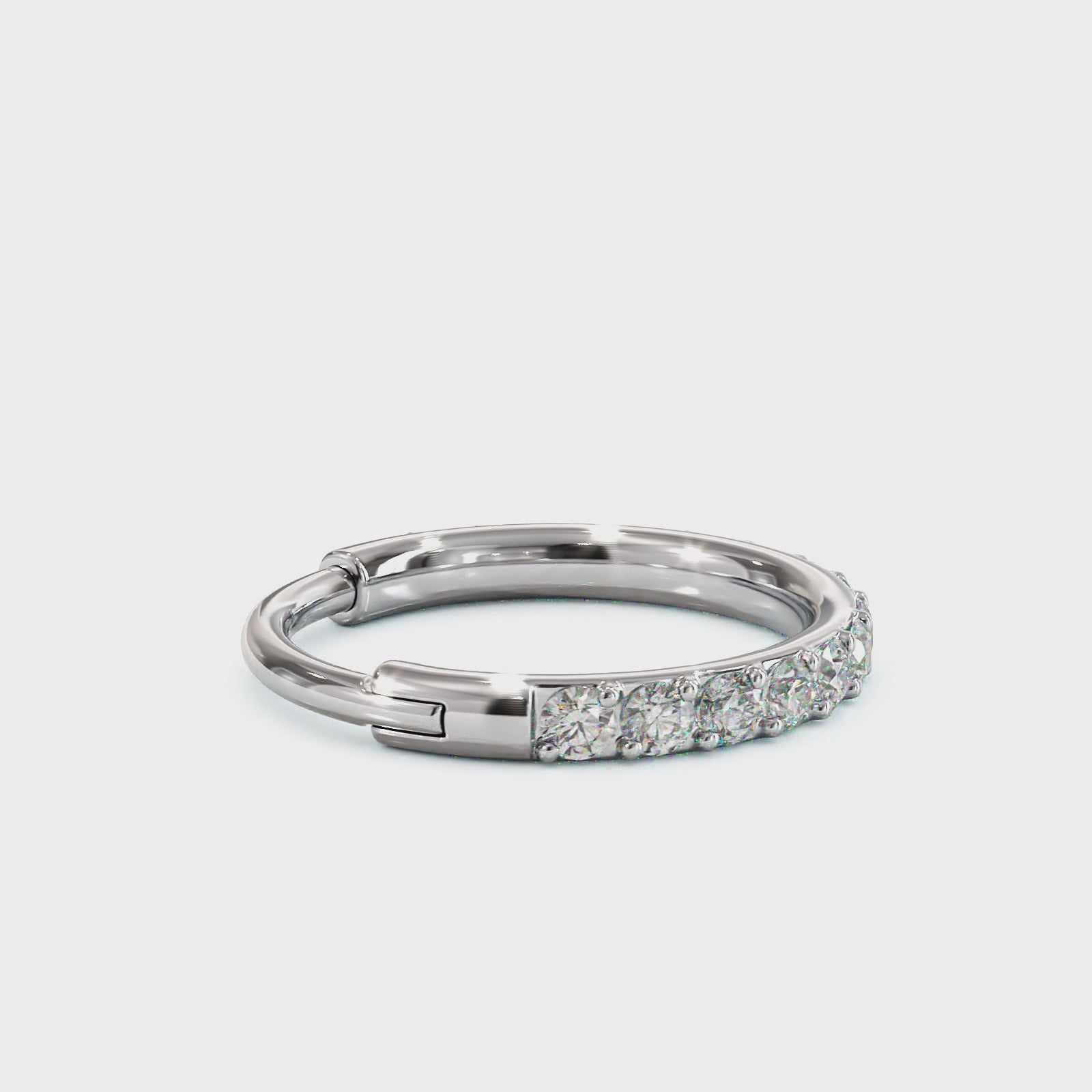Implant grade titanium hinged nose hoop ring piercing. This micro gem nose ring features a segment hinged closure for easy insertion and removal. 20G nose ring hinged segment hoop with dazzling forward facing cubic zirconia CZ stones.