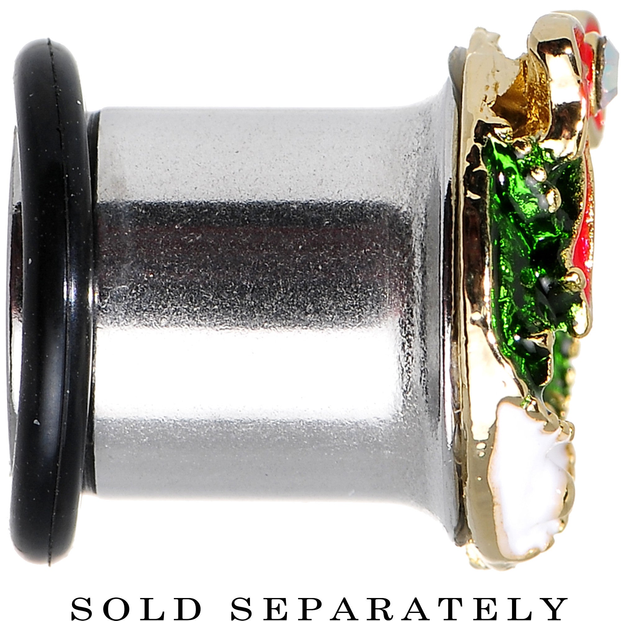 Item sold individually, purchase two for a pair. Have a very merry Christmas with this 10mm holiday themed stainless steel plug. The single flare ear stretcher features a cheerful, bow-topped wreath and includes one rubber O-ring. Pierced holiday ear expander ear gauge tunnel plug.