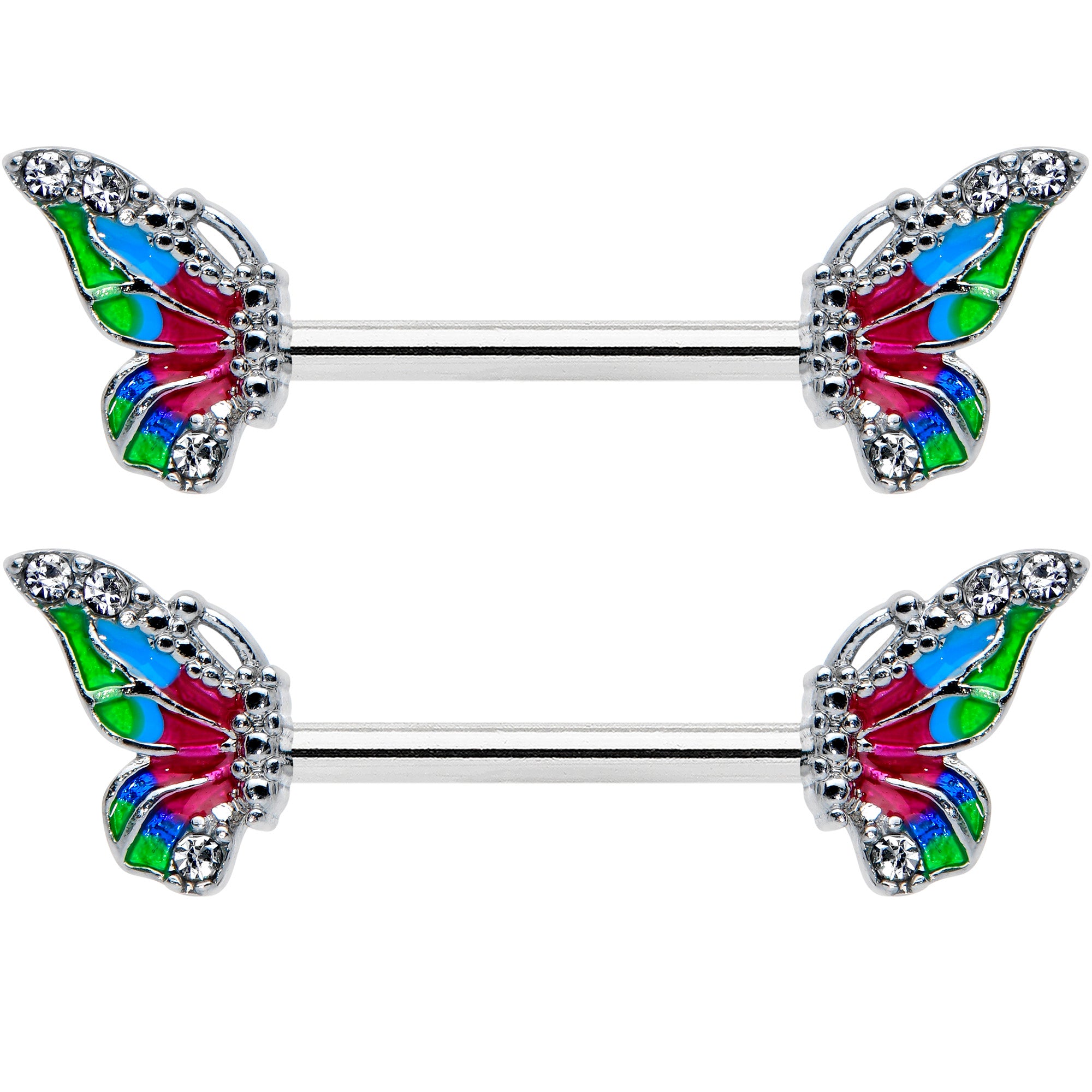 This 14 gauge nipple jewelry is something you can't help but notice! It's made with 12mm durable 316L surgical grade stainless steel straight barbells. Each of the ends features one half of a butterfly charm, inlaid in bright shades of pink, blue, and green. The butterflies are further embellished with clear gems for an added touch of glamour. Let your look spread its wings and soar into style with these bright and beautiful butterfly nipple piercing rings! Sold as a set of two.