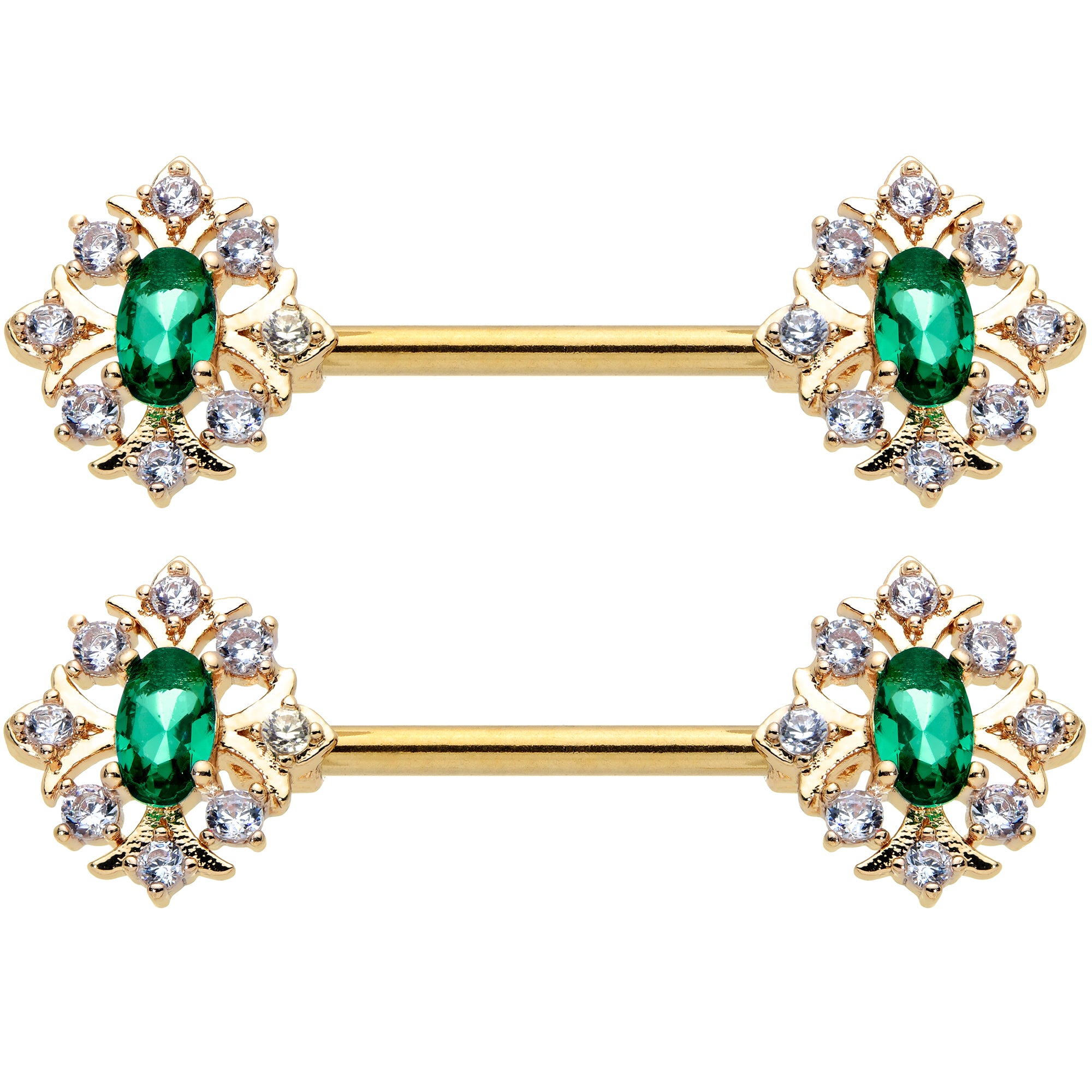 Take your nipple piercings back in time with this antique-inspired 14 gauge nipple jewelry! It's made with 12mm gold tone PVD over 316L surgical grade stainless steel straight barbells. Each of the ends features a large, oval green gem charm, set in a stylized rhombus that's embellished with clear gems for an elegantly retro appearance. Give an antique-inspired look to a modern piercing with this Art Deco styled nipple piercing jewelry! Sold as a set of two.