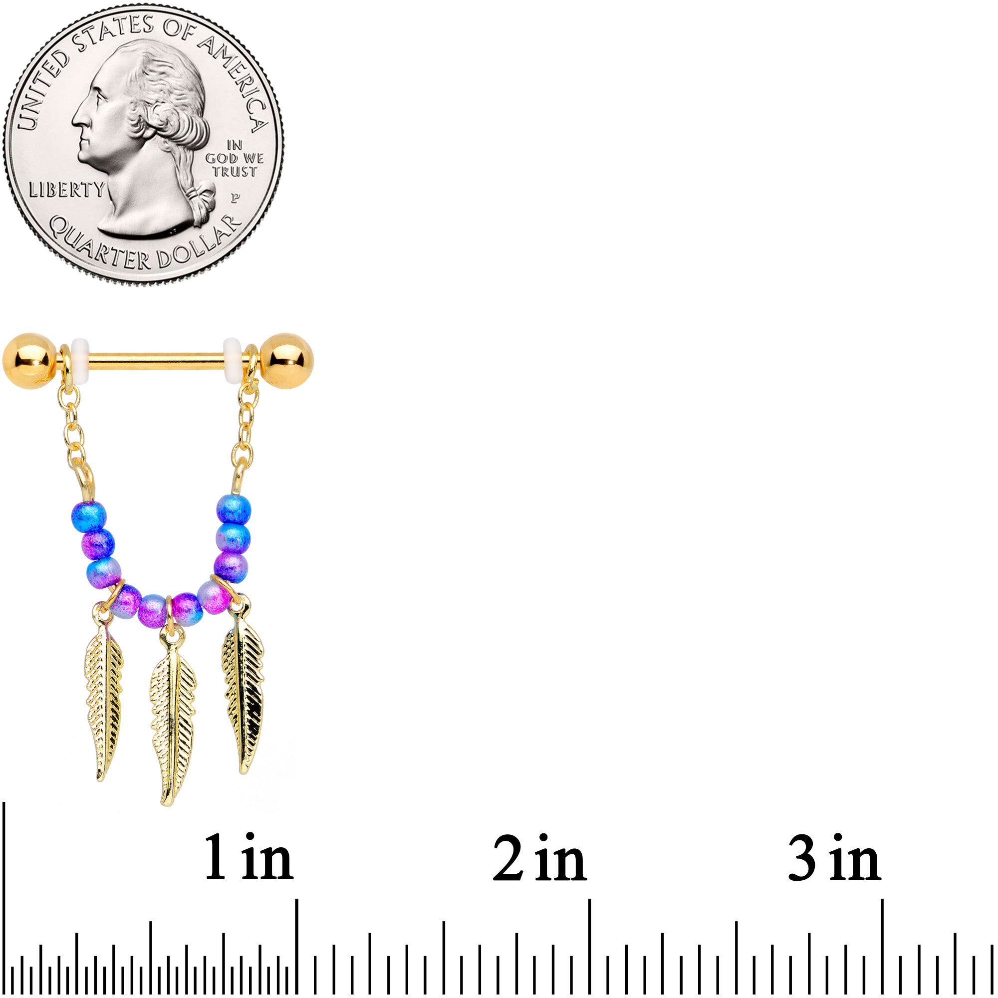 14 Gauge 1/2 Gold Tone Blue Purple Bead Feather Dangle Nipple Ring Set