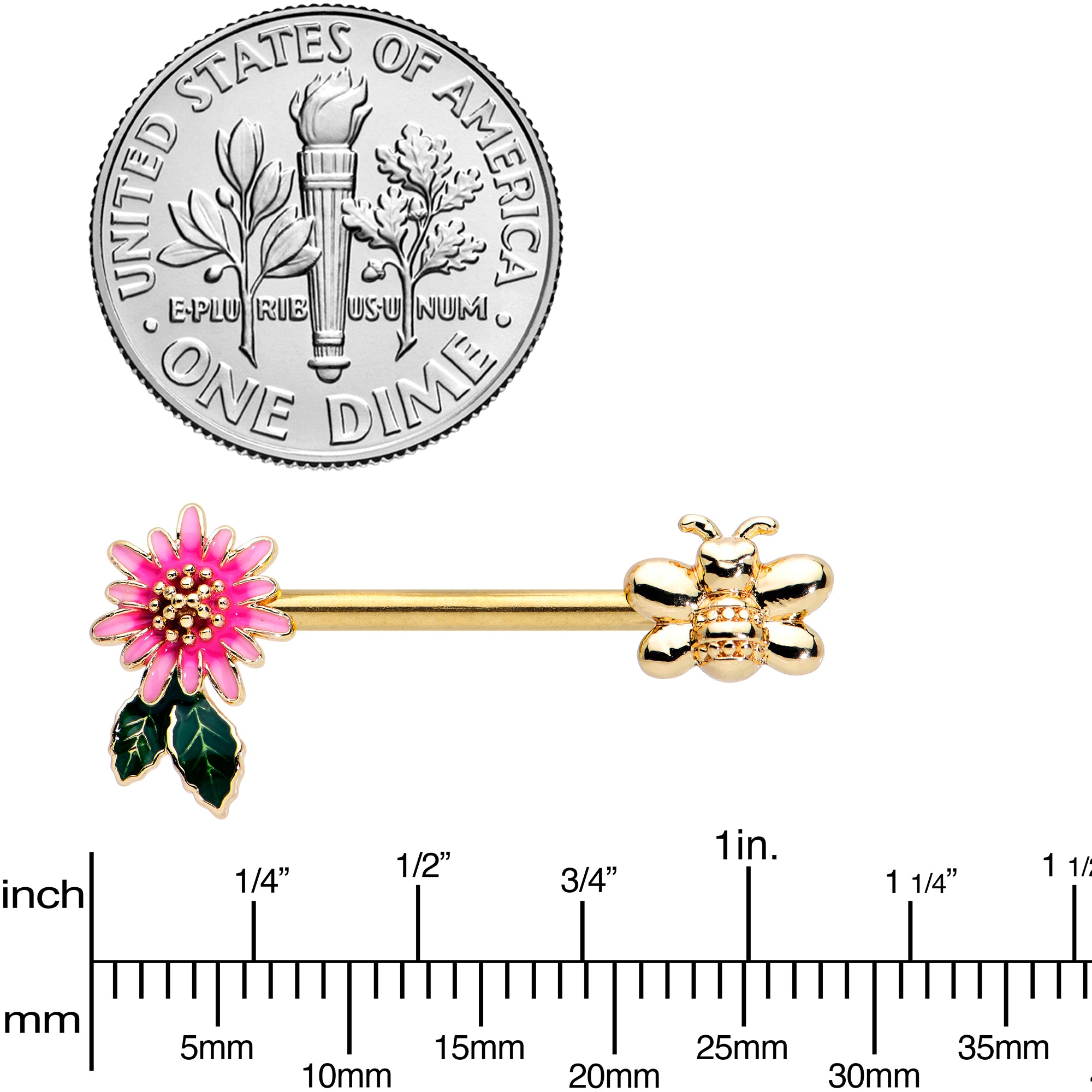 14G 1/2 Gold Tone Pink Flower Bee Barbell Nipple Ring Set