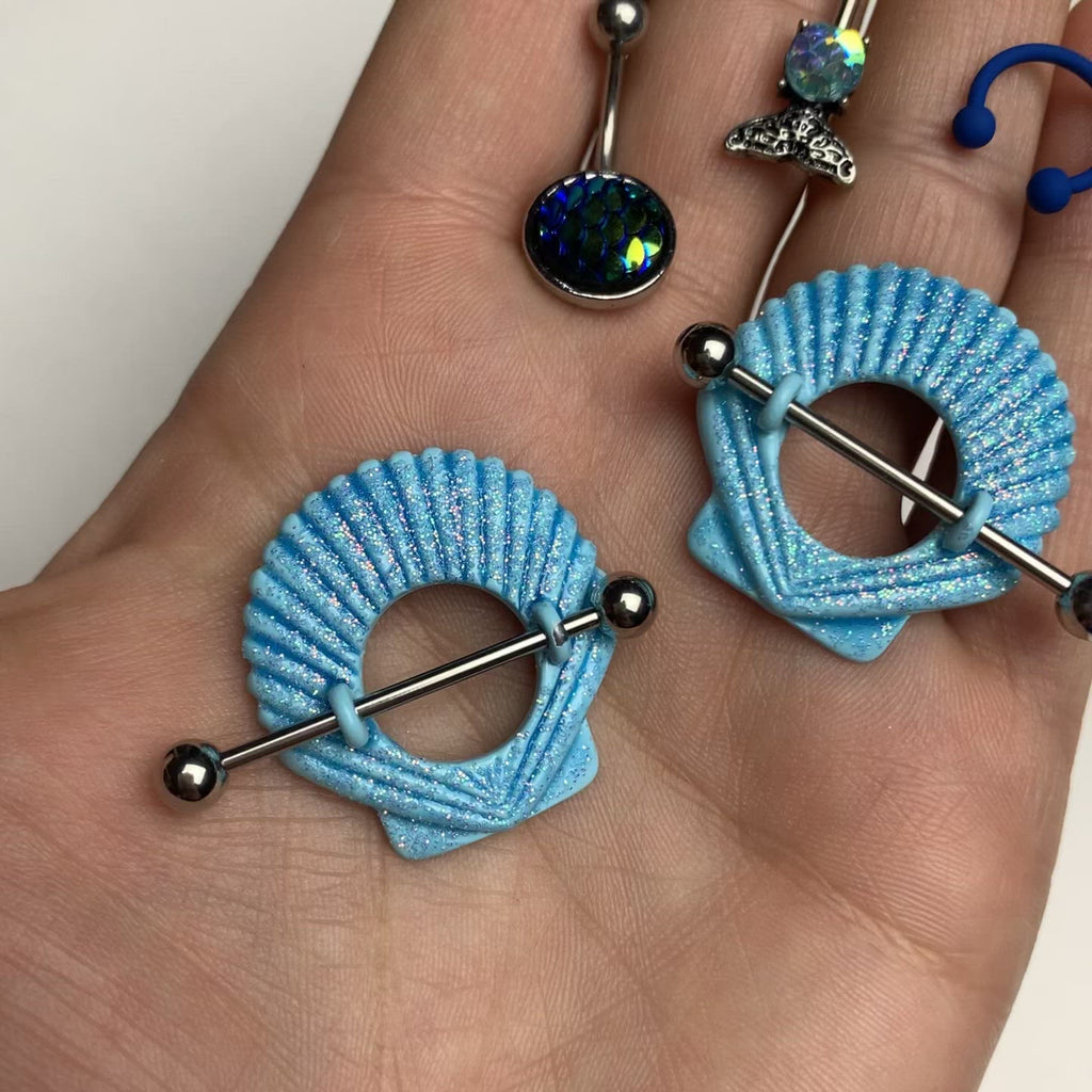 14G 29mm Iridescent Blue Scallop Shell Nautical Nipple Shield Set