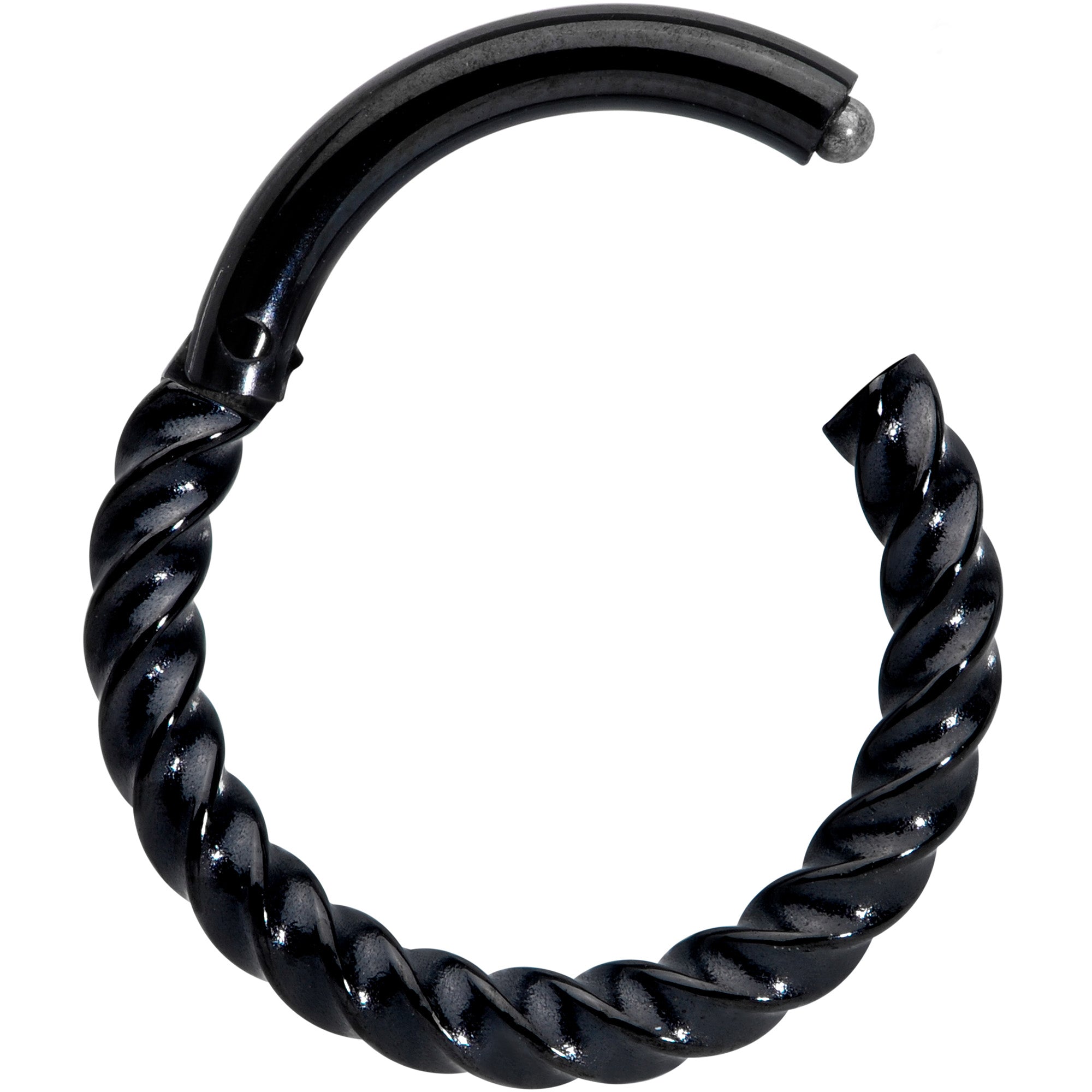 Add some twisted style to your septum piercings with this 14 gauge clicker ring! It's made with a 10mm black PVD over 316L surgical grade stainless steel hinged curved barbell. It features a simple but striking twisted design that's basic but never boring. You'll love how the clicker design makes it super easy to insert and remove and you can wear it in multiple piercings including septum, stretched lobes, and some lip piercings! Now that's a twist you're sure to love!