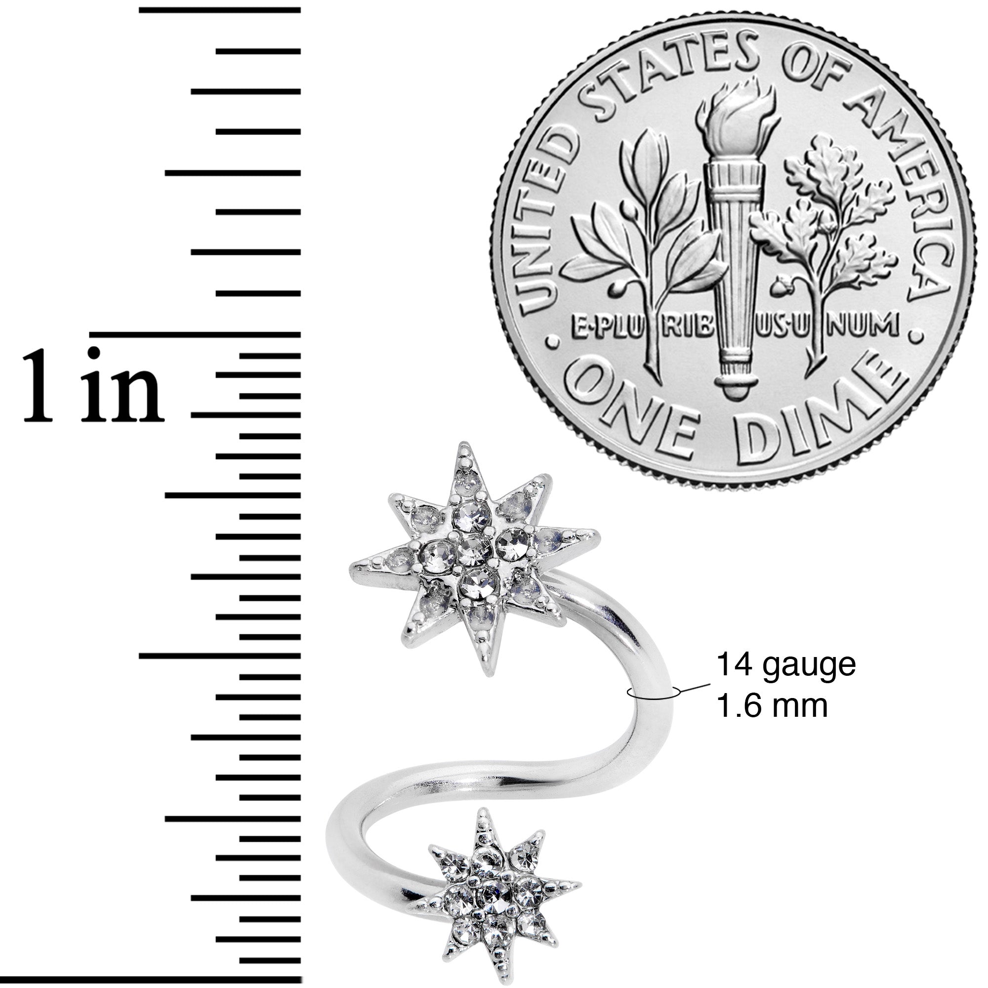 You'll never be lost when you can navigate by these stars! This 14 gauge twister earring is made with a 3/8" durable 316L surgical grade stainless steel spiral curved barbell. The ends feature eight-pointed star charms set with clear gems. Even better, this spiral jewelry works well in multiple piercings including the navel, lip, and eyebrow. You'll never be lost for options with this stunning navel piercing jewelry!