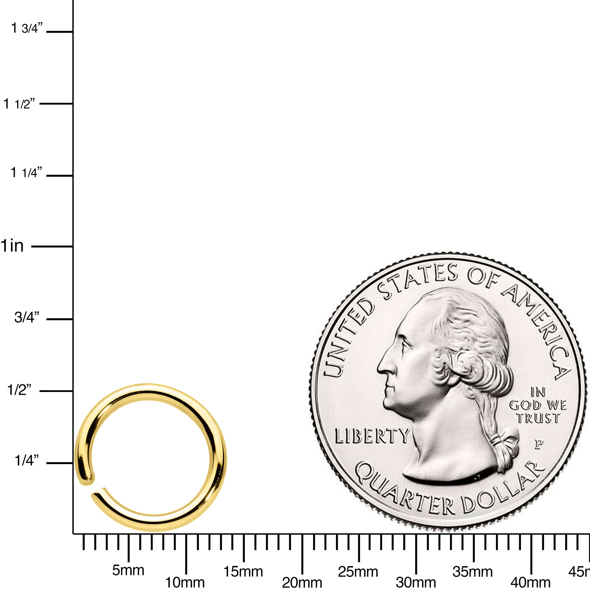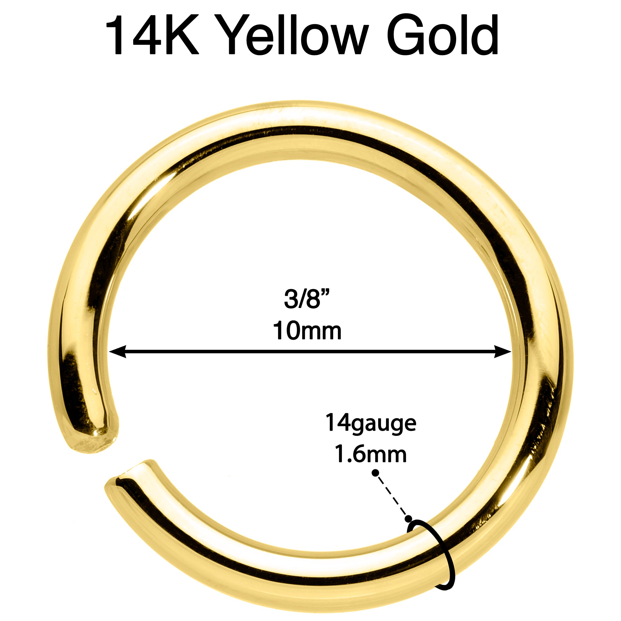 14 Gauge (1.6mm), 3/8" (10mm), Polished Finish Solid 14k Yellow Gold Circular Ring, Handmade in the USAQuality luxury 14k gold body jewelry made in the USA. Handmade in house by our skilled jewelers; this pieces is made to order.Introducing our Seamless Hoop Nose Rings, the epitome of convenience and style. These unique rings are designed without a bead or hinge, allowing for effortless insertion and removal. The ends of the rings gracefully bend away from each other, creating a convenient opening that can be threaded through your piercing. Once in place, simply push the ends back together to securely "close up" the ring. With our Seamless Hoop Nose Rings, you can enjoy a hassle-free experience without compromising on aesthetics. Upgrade your nose jewelry collection with these quick and easy-to-use rings that combine functionality with a sleek and fashionable design.