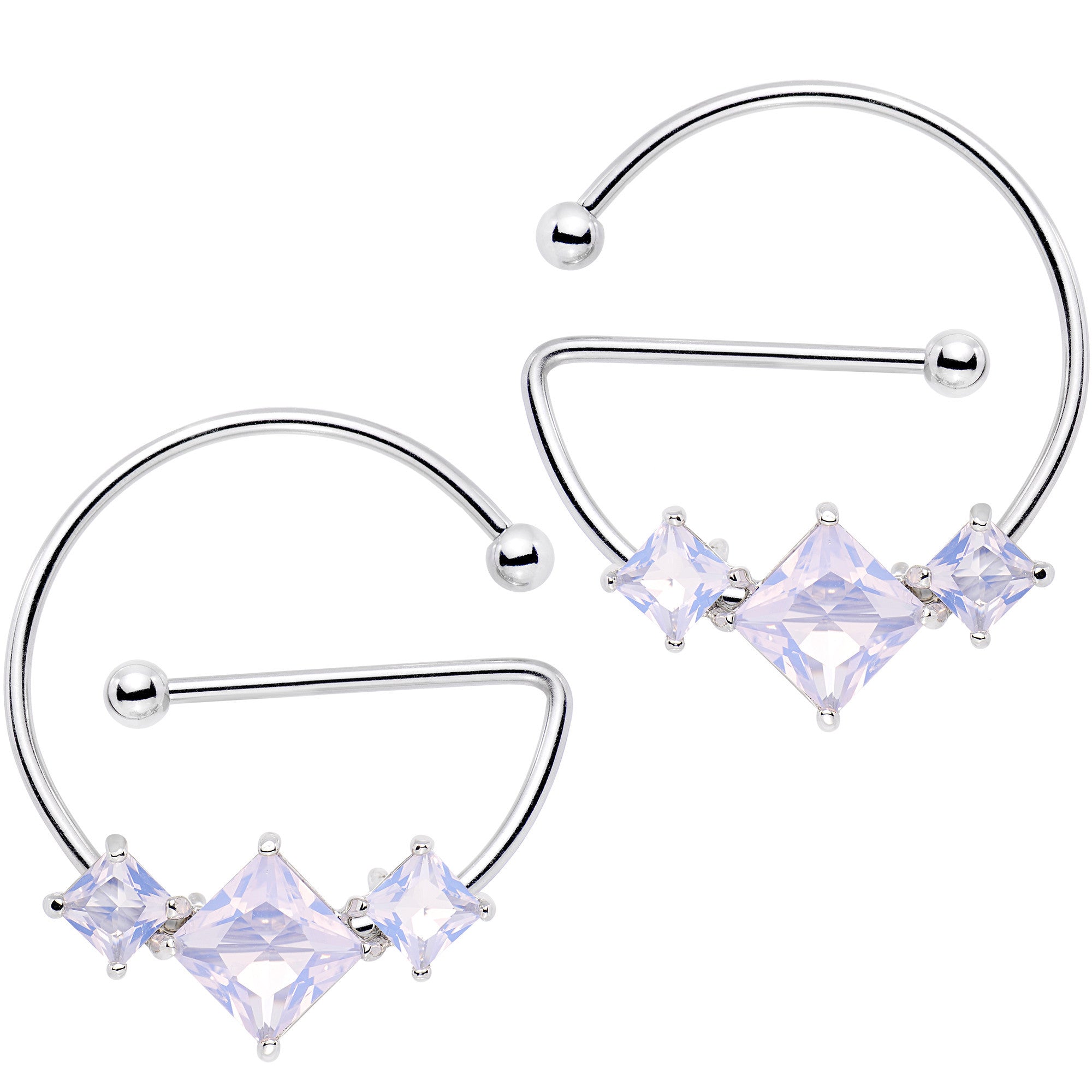 The next level in nipple piercing jewelry is here with this 14 gauge universal nipple ring set that can be worn vertically or horizontally with a simple turn of the rotating barbell. No matter how your nipples are pierced this body jewelry will have you covered with its 16mm annealed 316L surgical grade stainless steel barbells with a moveable charm formed with a trio of aurora gems. This universal nipple jewelry includes 4mm ball ends and features a top opening of 13mm in diameter, a bottom opening measuring 14mm in diameter, and is sold as a set of two.