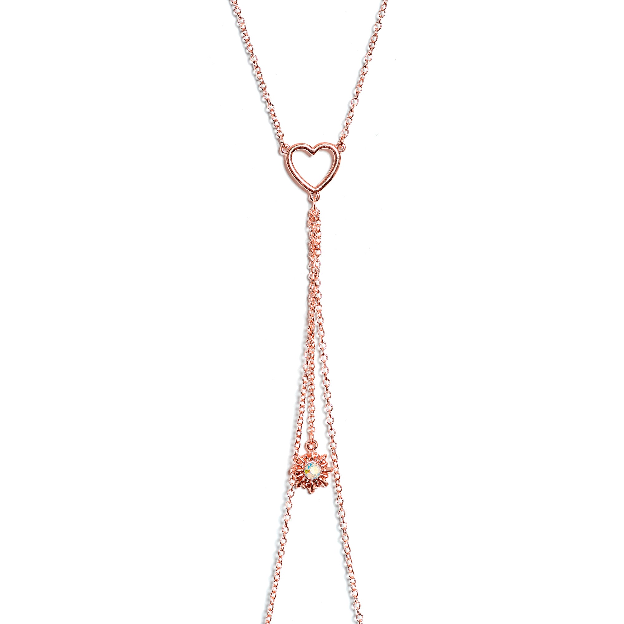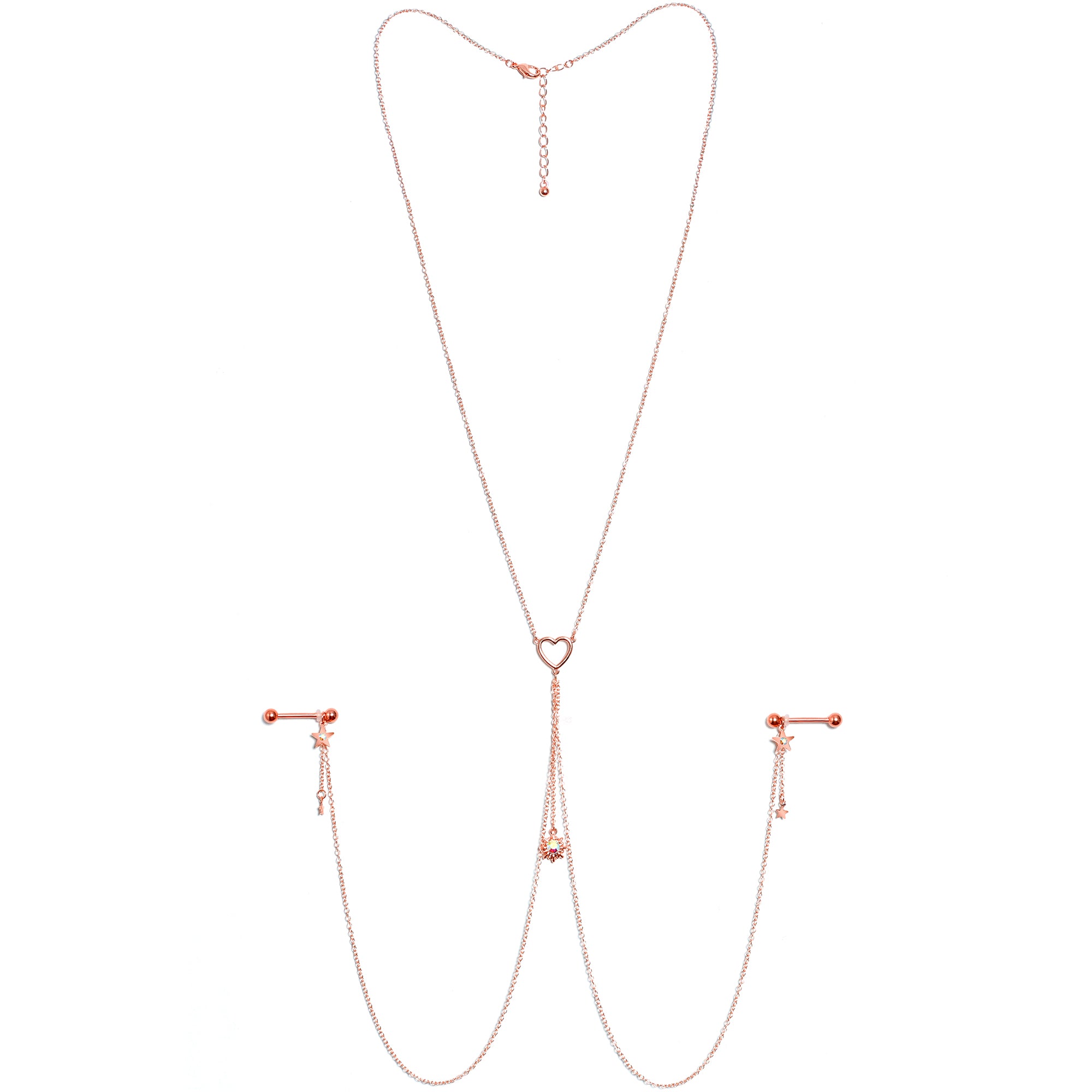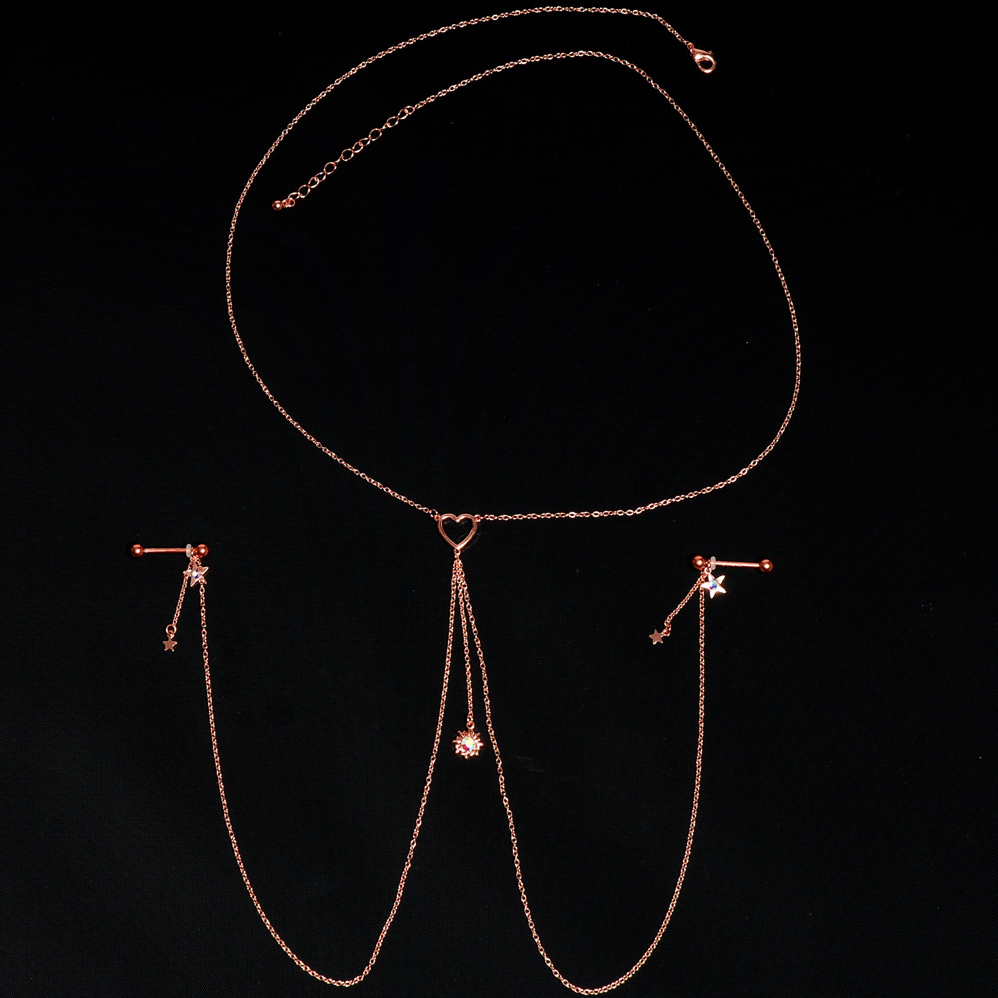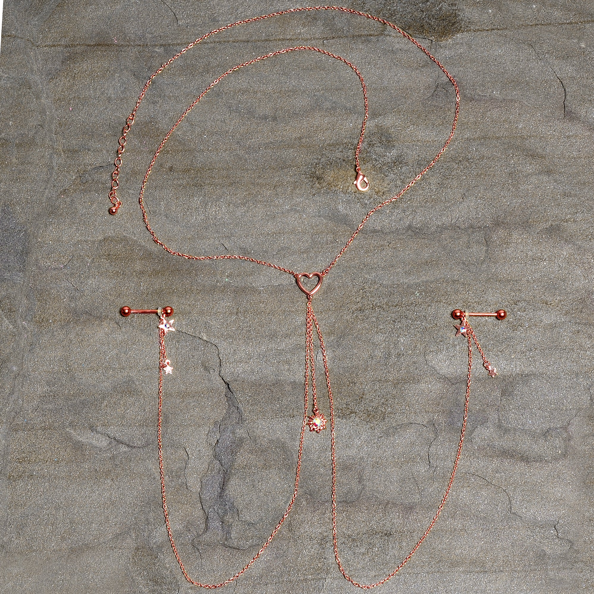 You're going to love this necklace to nipple chain to the stars and back! It features a 26" total length rose gold tone necklace that has a heart charm at the center. The heart has three lengths of matching chain dangling from it. The center one supports a gorgeous sun charm set at the center with an aurora gem. The other two chains are 11.5" (with some room for adjustment) and connect to the 16mm rose gold tone plated over 316L surgical grade stainless steel straight barbells with 5mm ball ends. Dangling from the barbells are rose gold tone star charms with a single aurora gem and tiny unadorned rose gold tone star charms than dangle from a matching length of chain. With this stunning necklace nipple chain, your nipple piercings are sure to be stars