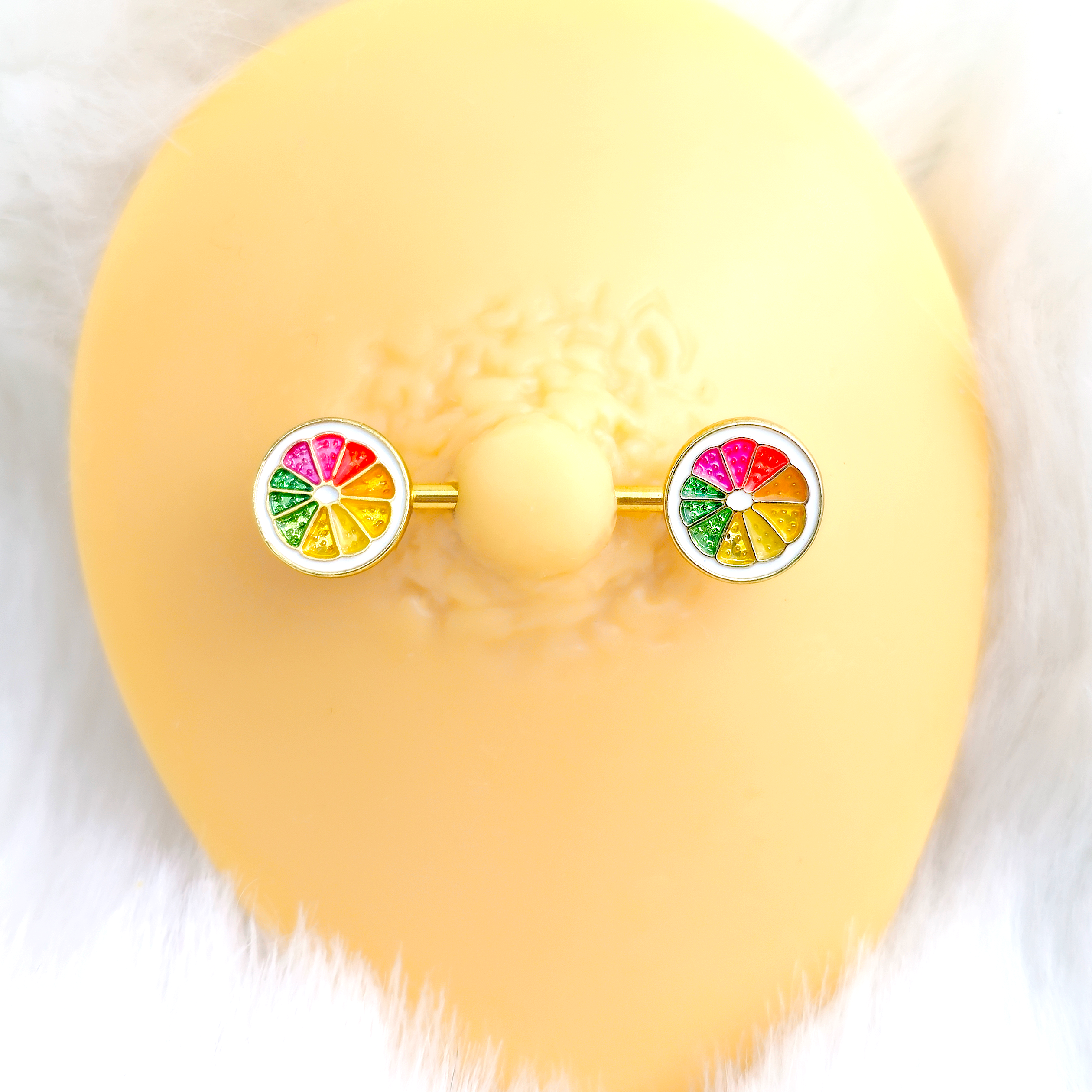 These grapefruits won't just make for a tasty breakfast, they'll glam up your nipple piercings at every meal with this 14 gauge nipple jewelry!! They're made with a 16mm gold tone PVD over 316L surgical grade stainless steel straight barbells and the ends each feature a sliced grapefruit charm with a ring of white around the outer edge - just like the real thing. However, these grapefruits have segments in a rainbow of colors! Now that's a juicy pair of nipple jewelry! Sold as set of two.