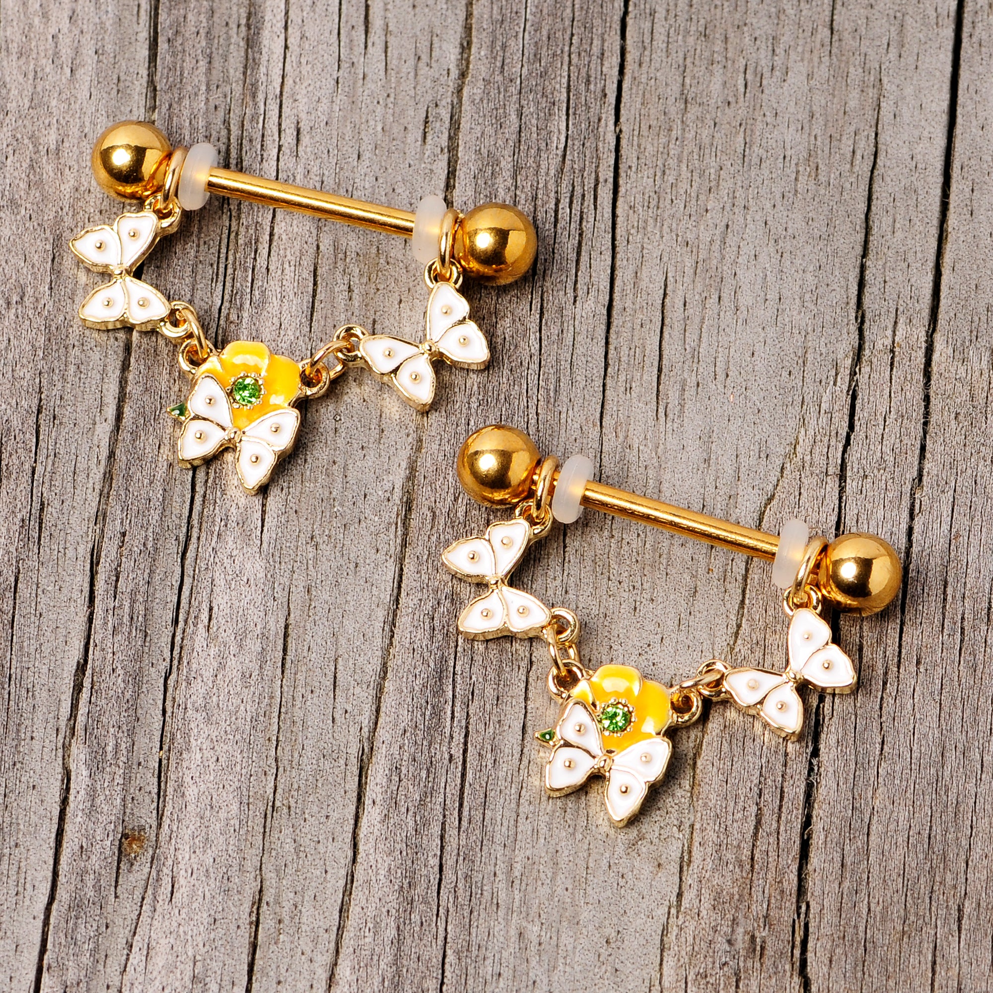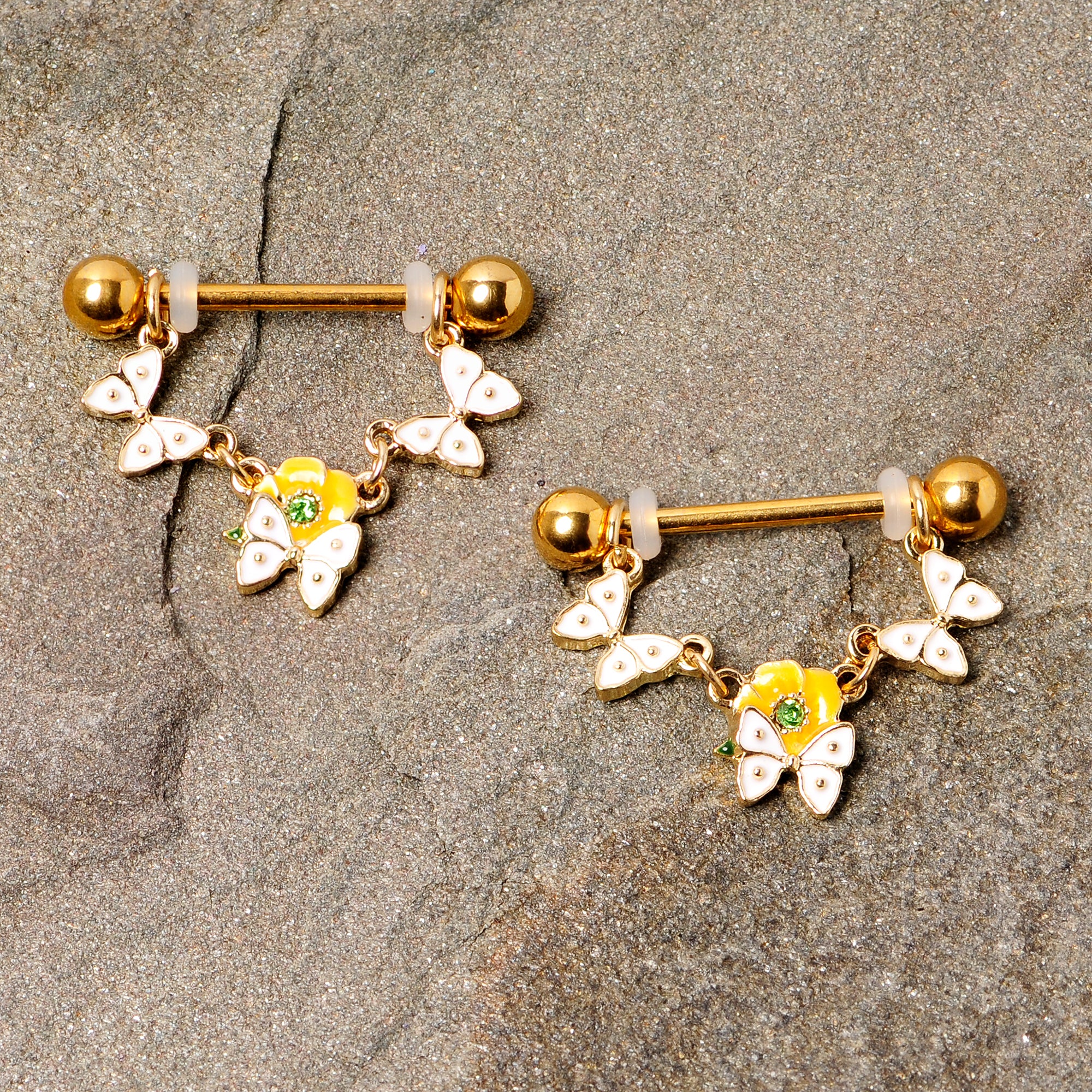 These beautiful butterflies just want to take a breather while hanging from your nipple piercings with this 14 gauge nipple jewelry! It's made with 16mm gold tone PVD over 316L surgical grade stainless steel straight barbells with 5mm ball ends. It features a dangling garland of three white butterfly charms and perched over the center is a yellow flower charm featuring a green gem at the center. This is a look that will have you feeling like springtime all year long! Sold as a set of two.