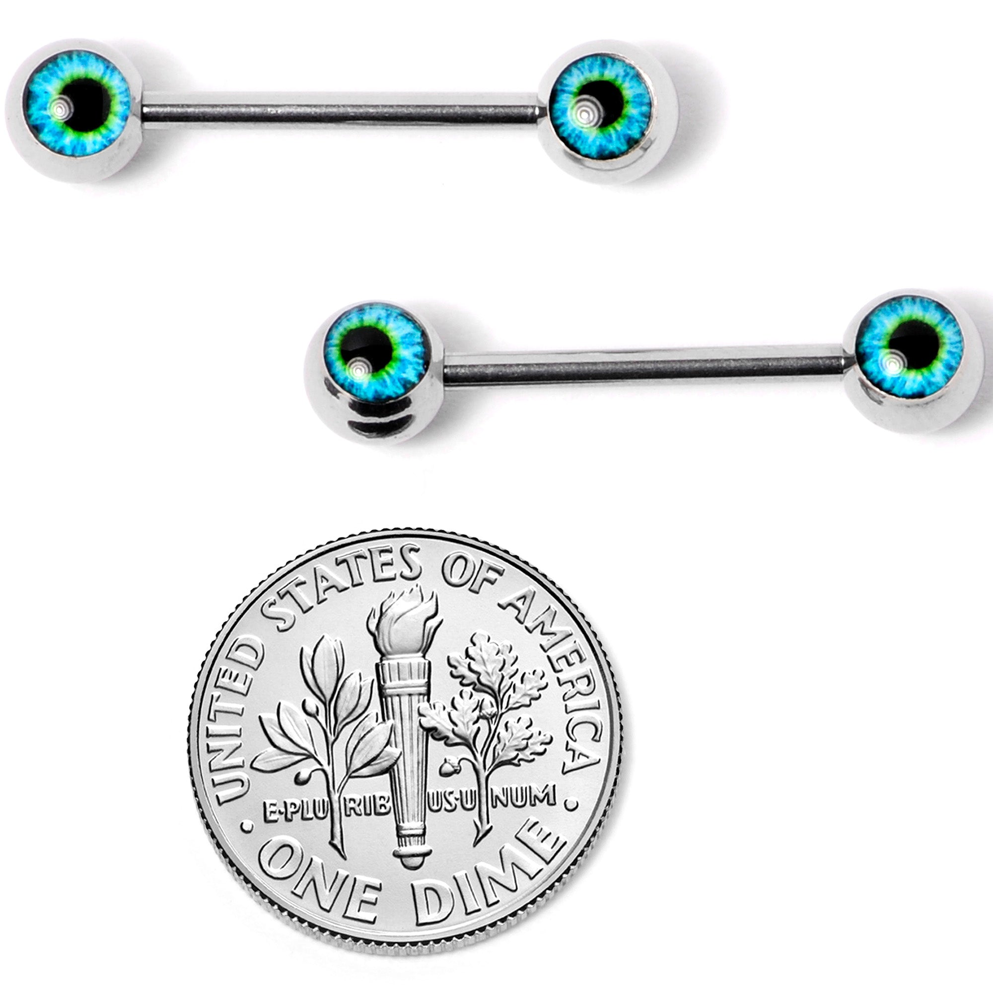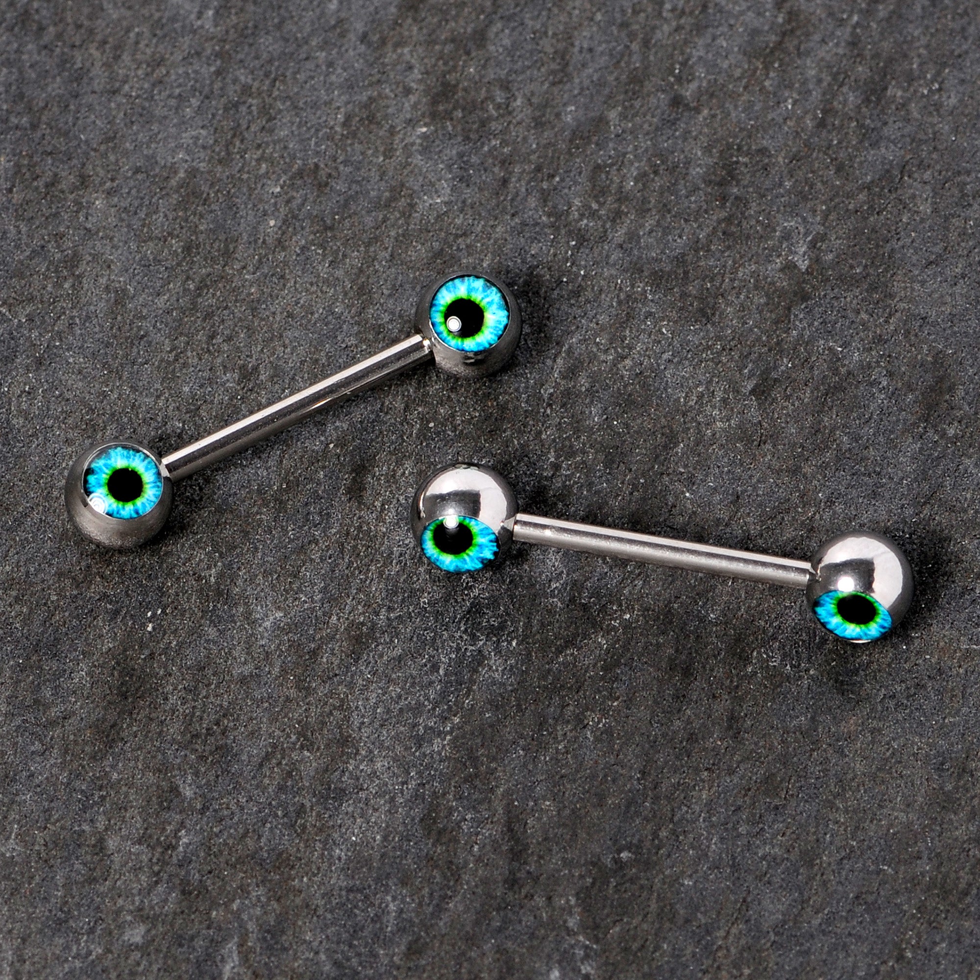 If you're ready to get into the spirit of Halloween then you will love these 14 gauge nipple piercings with a little spooky spirit! Made with 16mm durable 316L surgical grade stainless steel straight barbells, this nipple jewelry features 6mm ball ends with human blue eye inlays for an eerily creepy look. Sold as a set of two.
