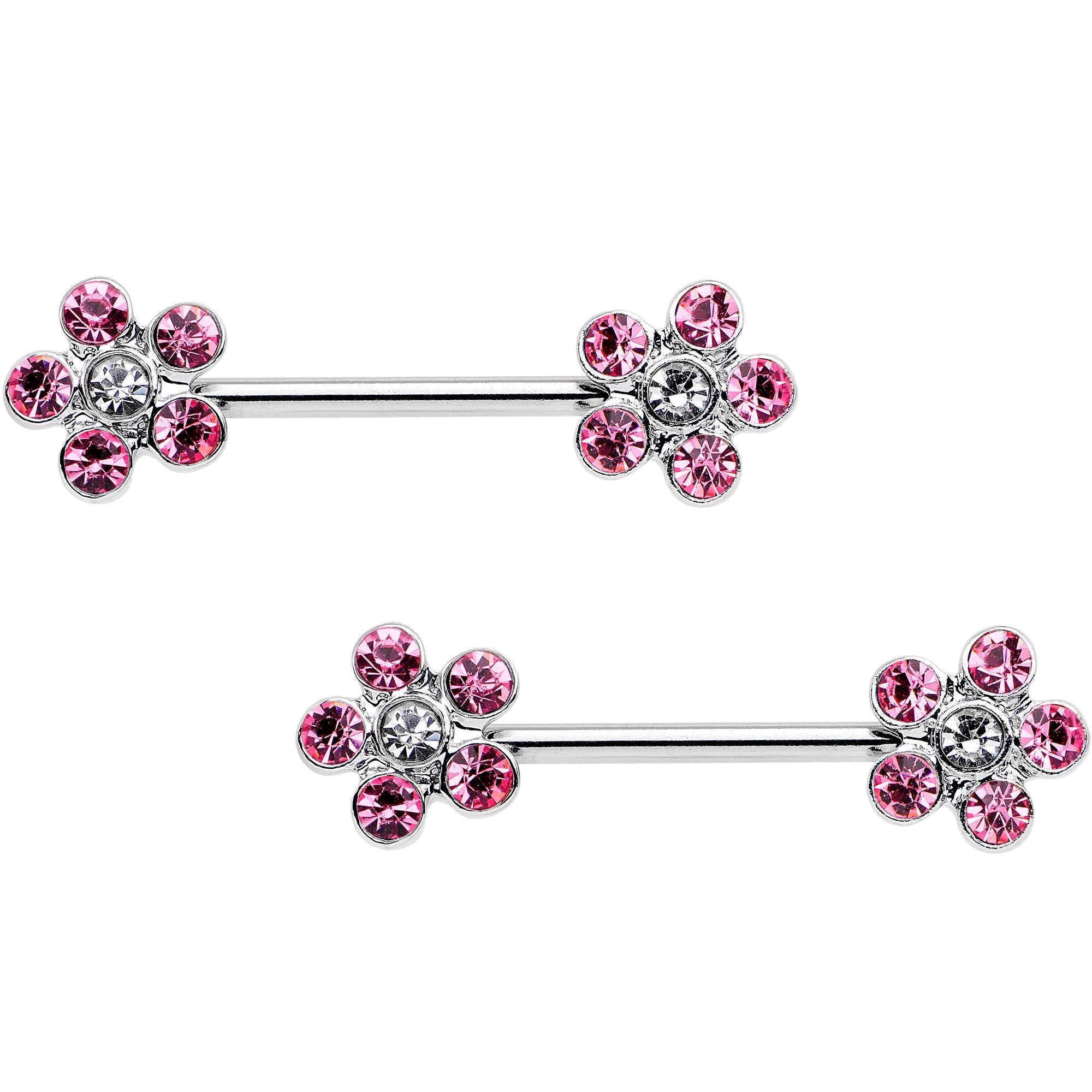 Looking to add a little bit of the beauty of flowering fields to your nipple piercings? Well, this pair of 14 gauge barbell nipple rings will be exactly what you need to gain the floral look you've always desired. The 16mm length straight barbell used for this set of nipple jewelry is made from durable 316L surgical grade stainless steel and includes clear and pink cubic zirconia gem flower charms. Best part? This nipple jewelry is sold as a set of 2 so both your breasts can look their best!