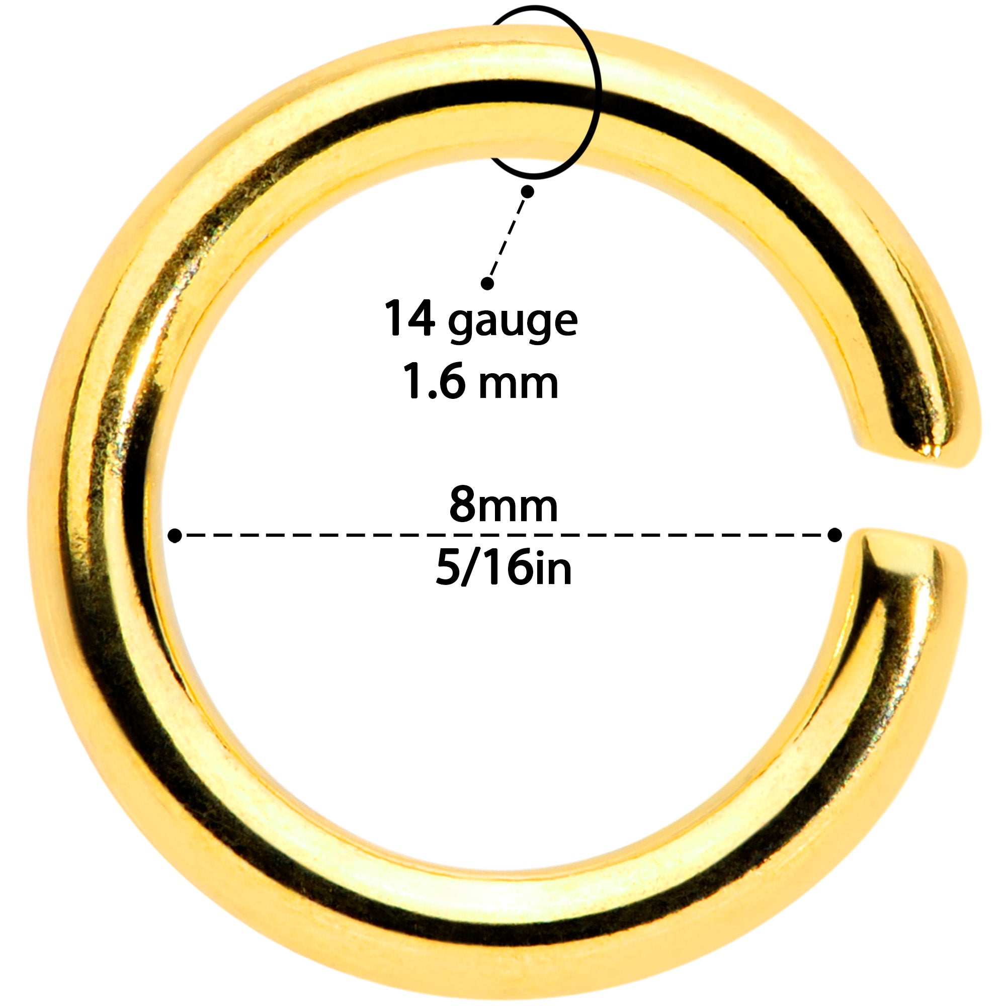 Whether you have multiple cartilage piercings and prefer a matching look or are simply prone to losing things, this set of 14 gauge cartilage rings has you covered. Six are made with 8mm durable 316L surgical grade stainless steel circular rings and the other six are made with 8mm gold tone anodized over 316L surgical grade stainless steel circular rings for a colorful and comfortable feel. This cartilage jewelry is super easy to insert and remove - simply twist the ring open, insert, and then twist gently shut again. And you can rock these rings in multiple piercings including septum, navel, some eyebrow piercings, and stretched lobes! Sold as a set of twelve.