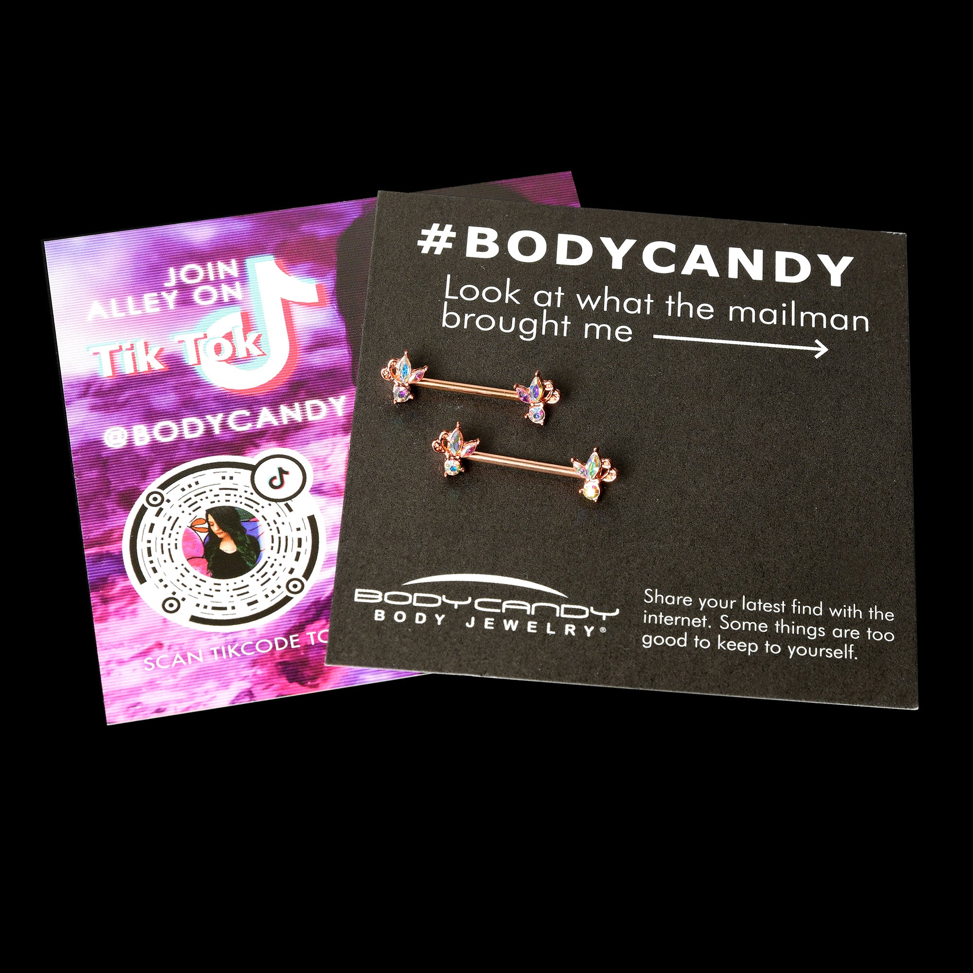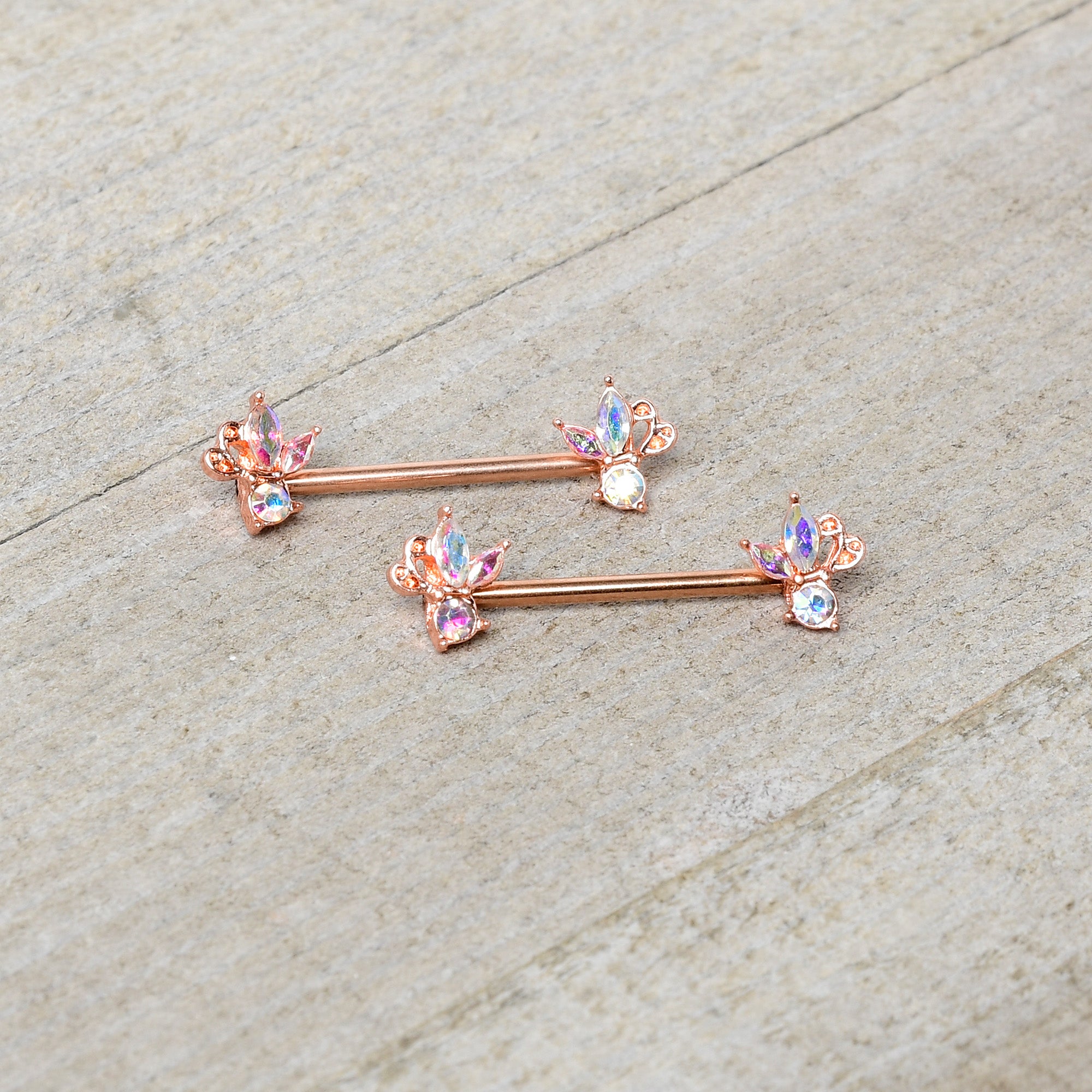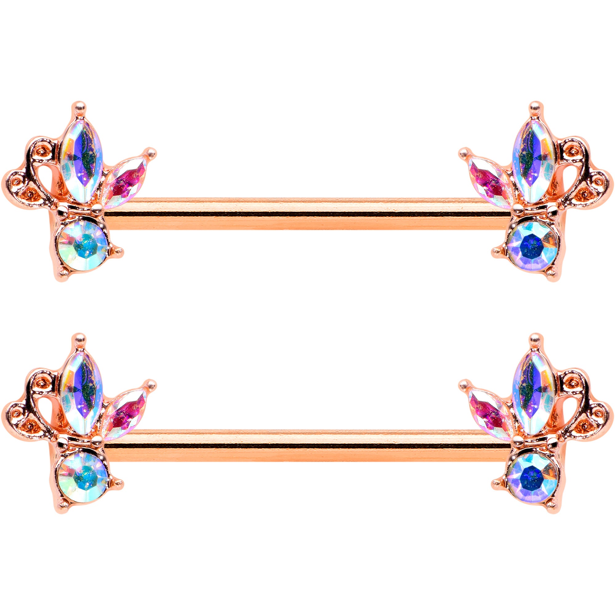 14G 5/8 Aurora CZ Gem Rosy Hue Fleur de Lis Butterfly Barbell Nipple Ring Set