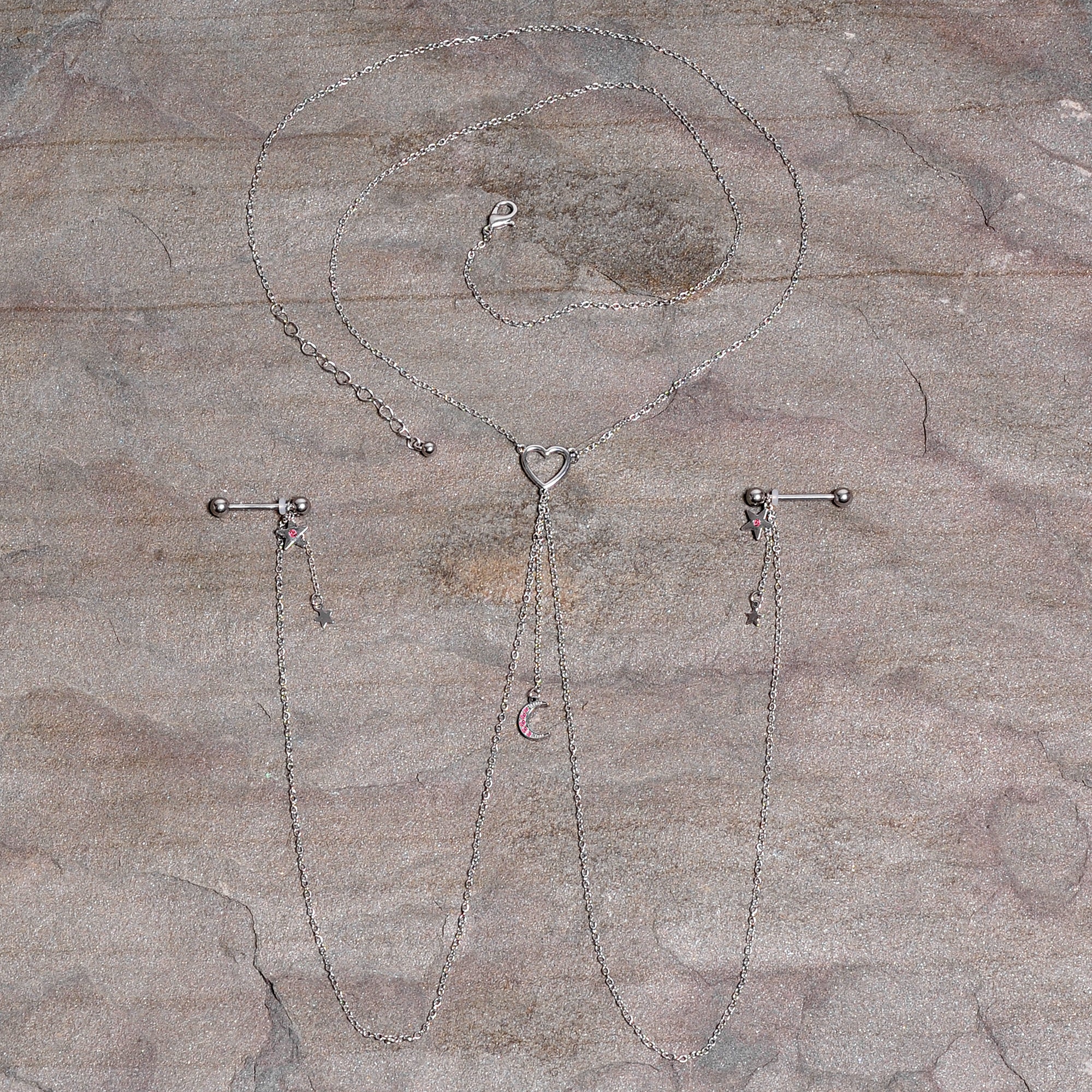 You're going to love this nipple chain necklace to the stars and back! It features a 14" maximum necklace that has an openwork heart at the center. The heart has three lengths of matching chain dangling from it. The center one is 2" in length and supports gorgeous crescent moon charm that's set with pink gems. The other two chains are 12" and connect to the 16mm durable 316L surgical grade stainless steel straight barbells with 5mm ball ends. Dangling from the barbells are star charms with pink gems set at the center and tiny unadorned star charms than dangle from a 1" length of chain. With this stunning necklace nipple chain, your piercings are sure to be stars!