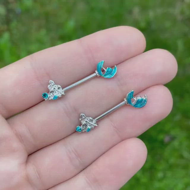 14G 9/16 Aqua Gem Gazing Mermaids Barbell Nipple Ring Set