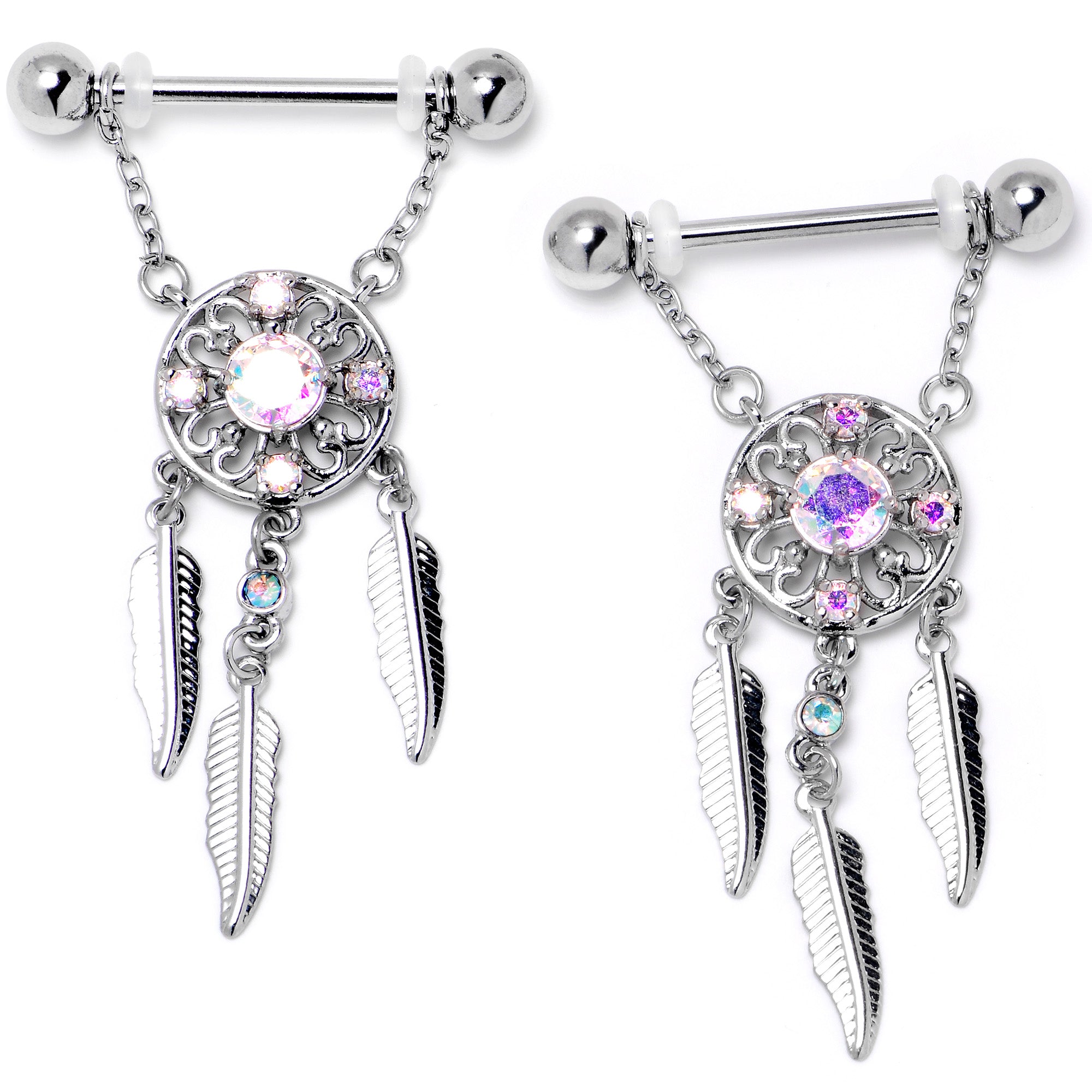 14 Gauge 9/16 Aurora CZ Gem Dreamcatcher Dangle Nipple Ring Set