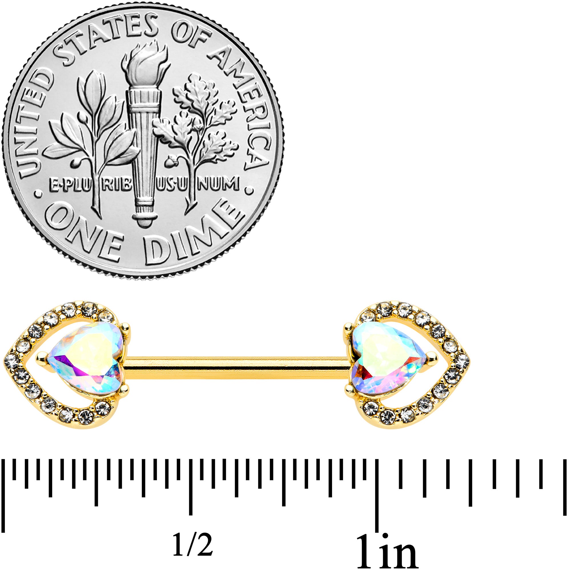 Look luxe and love it without breaking the bank with this 14 gauge nipple jewelry! It's made with 14mm gold tone PVD over 316L surgical grade stainless steel straight barbells. Each of the ends features a heart charm, paved with clear gems and set with a heart-shaped aurora gem at the top. You're going to fall in love with the opulent look of these heart-themed nipple piercing rings! Sold as a set of two.