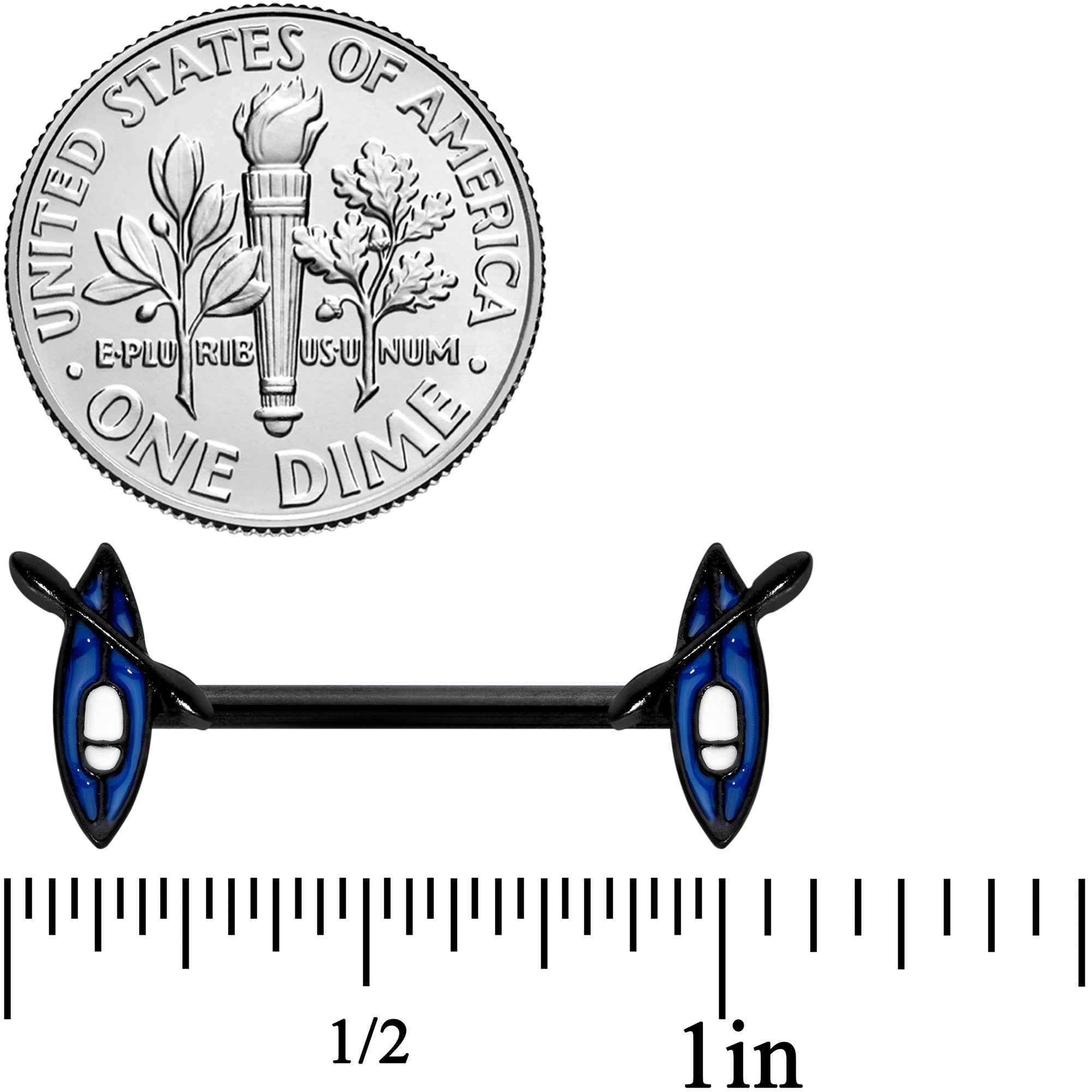 No matter how far you are from the water, you'll still be the first one on the boat with this 14 gauge nipple jewelry! It's made with 14mm black PVD over 316L surgical grade stainless steel straight barbells. Each of the ends features a blue boat charm, cleverly detailed with a black paddle laid diagonally across it. Whether water sports thrill you or you're crazy for canoes and kayaks, these nautical-themed nipple piercing rings are sure to make waves! Sold as a set of two.