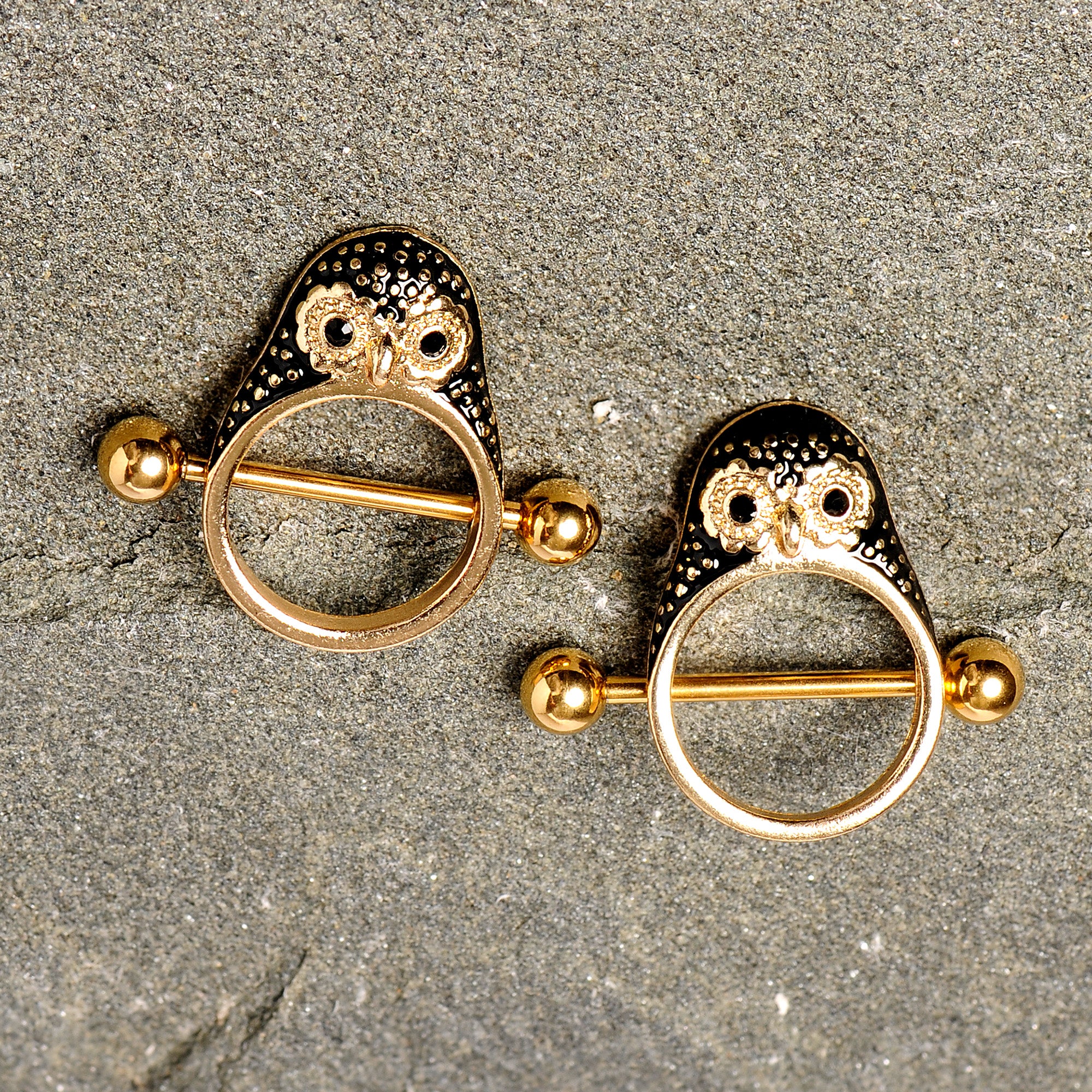 Now this is a set of hoot owls that will look awesome all the time! This 14 gauge nipple jewelry is made with 14mm gold tone PVD over 316L surgical grade stainless steel straight barbells with 5mm ball ends. The shield portion features a gorgeous pair of barn owl charms with black detailing and black gems for eyes. These owls have a vintage appearance and a uniquely thoughtful style that really makes them stand out. These are some birds you'll love to have nested in your nipple piercings! Sold as a set of two.
