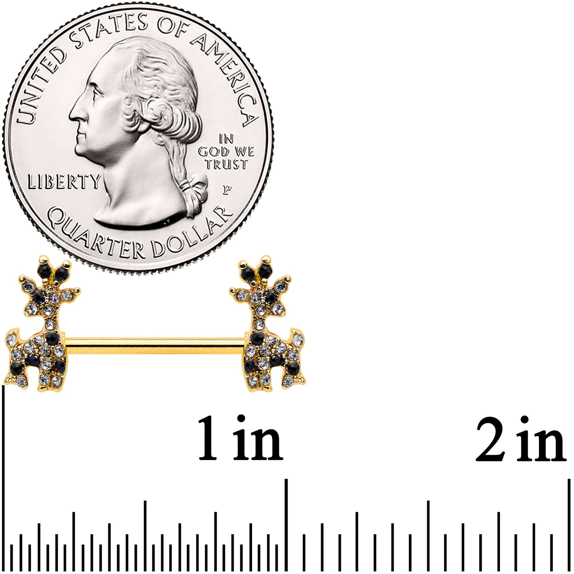 The deer on this 14 gauge nipple jewelry are all decked out and looking divine! It's made with 14mm gold tone PVD over 316L surgical grade stainless steel straight barbells. Each of the ends features a deer charm, embellished with black and clear gems for some serious style. Whether you're a deer devotee or a happy hunter, these does are sure to have you singing! Sold as a set of two.