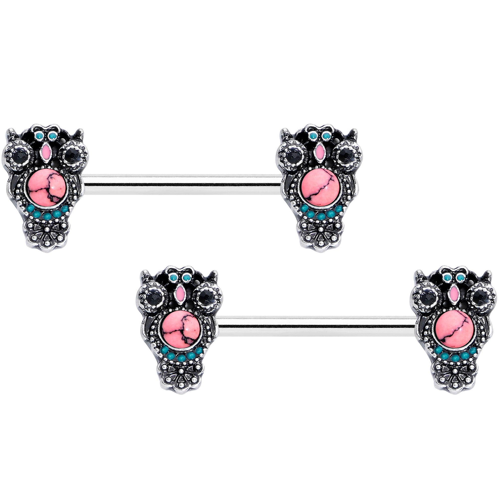 The feathered friend on this 14 gauge nipple jewelry will have your nipple piercings looking fine! These nipple piercings are made with 14mm durable 316L surgical grade stainless steel straight barbells and feature owl charms with black gem eyes. It also has pink orbs set into its tummy and beak. These nipple rings are bold and colorful, just like the bird on them. They're sure to bring a dose of vibrant style to your nipple piercings. Sold as a set of two.