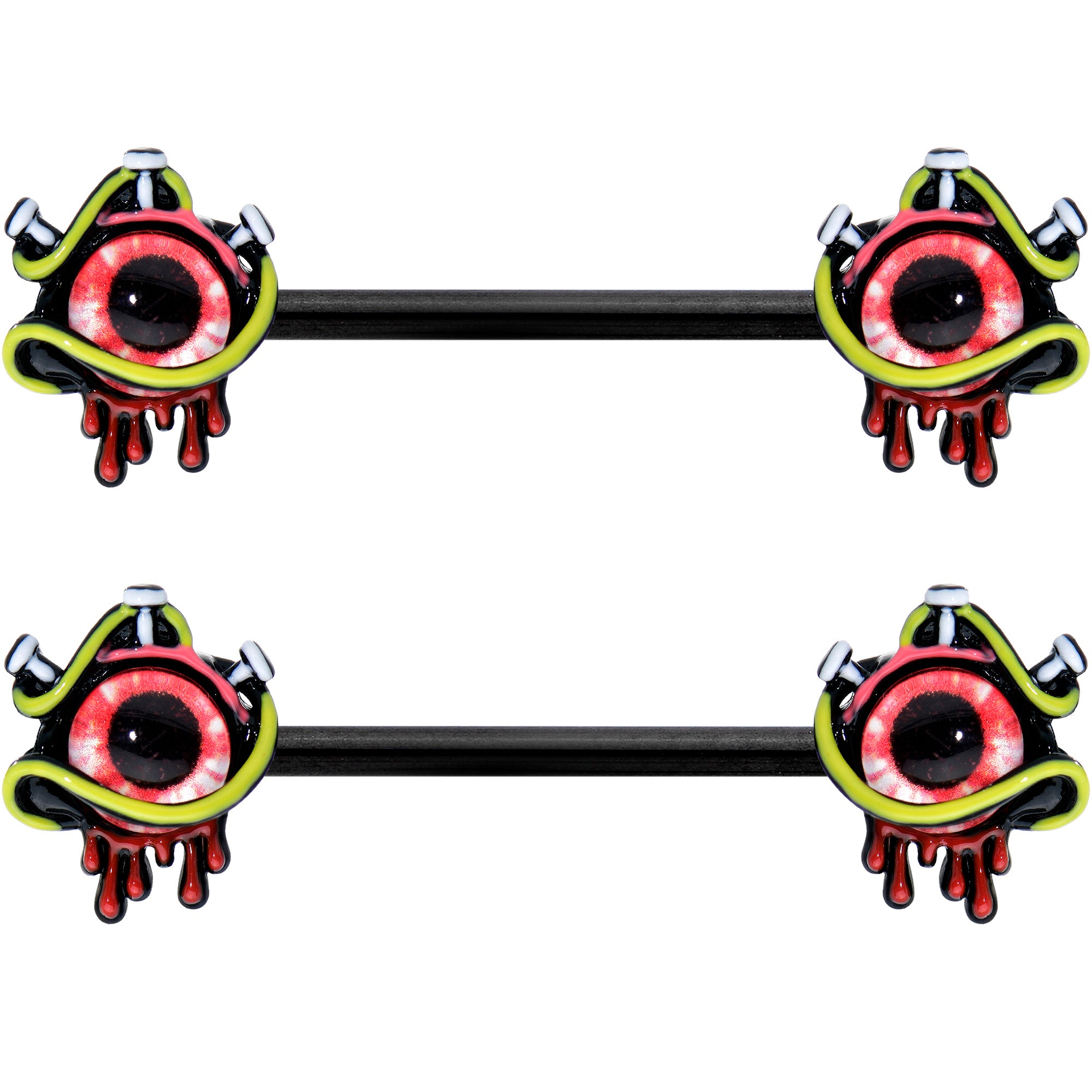 You'll have all eyes on you with this creepy 14 gauge nipple jewelry! It's made with 14mm black PVD over 316L surgical grade stainless steel straight barbells. Each of the ends features an eyeball charm, embellished with yellow detailing and white spike charms coming from the tops. You'll definitely want to keep an eye on these creepy cool Halloween nipple piercing rings! Sold as a set of two.