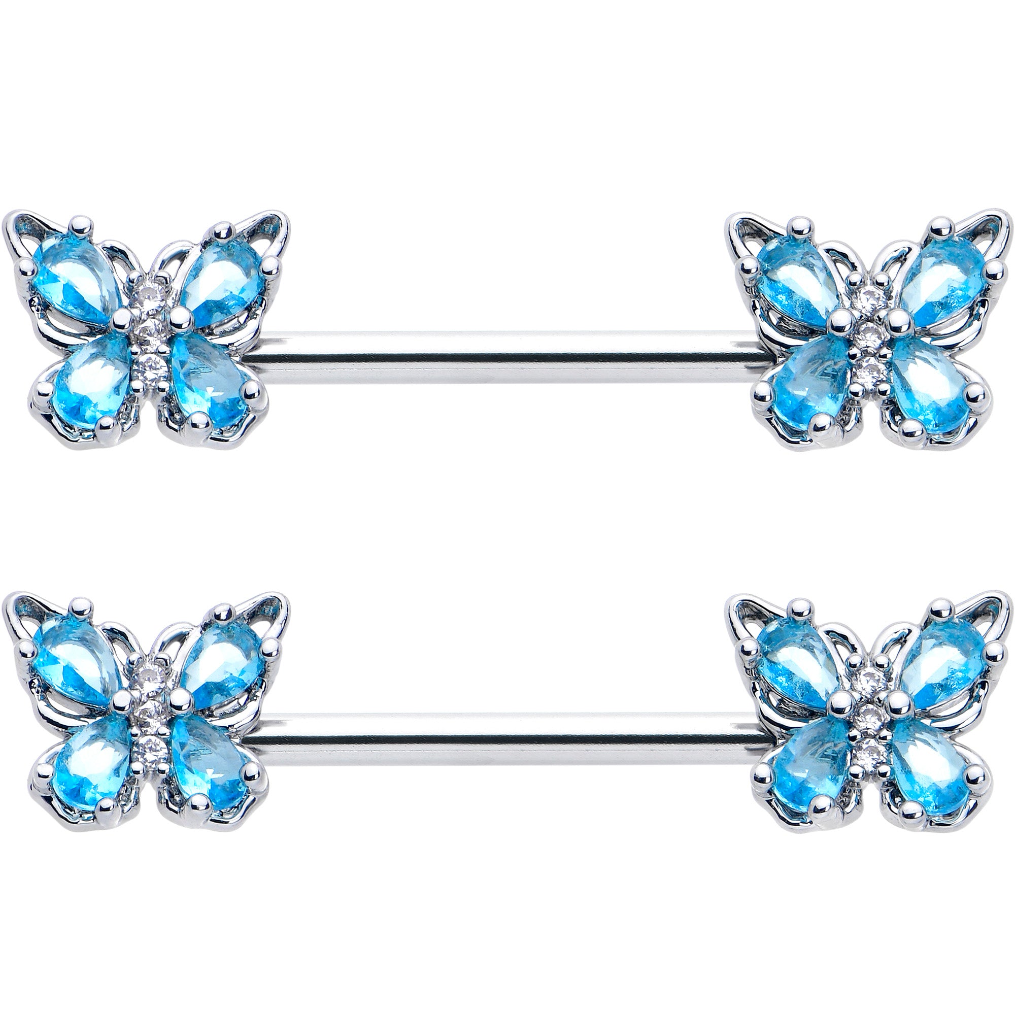 The butterfly on this 14 gauge nipple jewelry will make you want to go for baroque. It's made with 14mm durable 316L surgical grade stainless straight barbells. Each of the ends features a butterfly charm, with wings set with large blue gems. The butterflies are further embellished with clear gems for an ornate appearance. These opulent butterfly nipple piercing rings will make you want to fly. Sold as a set of two.