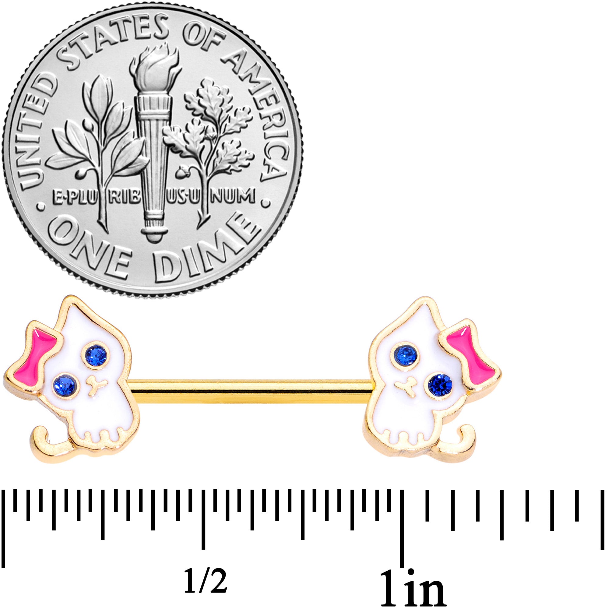 This 14 gauge pretty kitty is flaunting her pretty pink bow in hopes that someone will give her a fur-ever home! This nipple jewelry is made with 14mm gold tone PVD over 316L surgical grade stainless steel straight barbells. The ends feature a white kitty cat charm with blue gem eyes and a charming pink bow by one ear. Her big blue eyes are sure to win your heart. a So go ahead and take these cat nipple rings home - she's sure to look purrfect in your nipple piercing! Sold as a set of two.