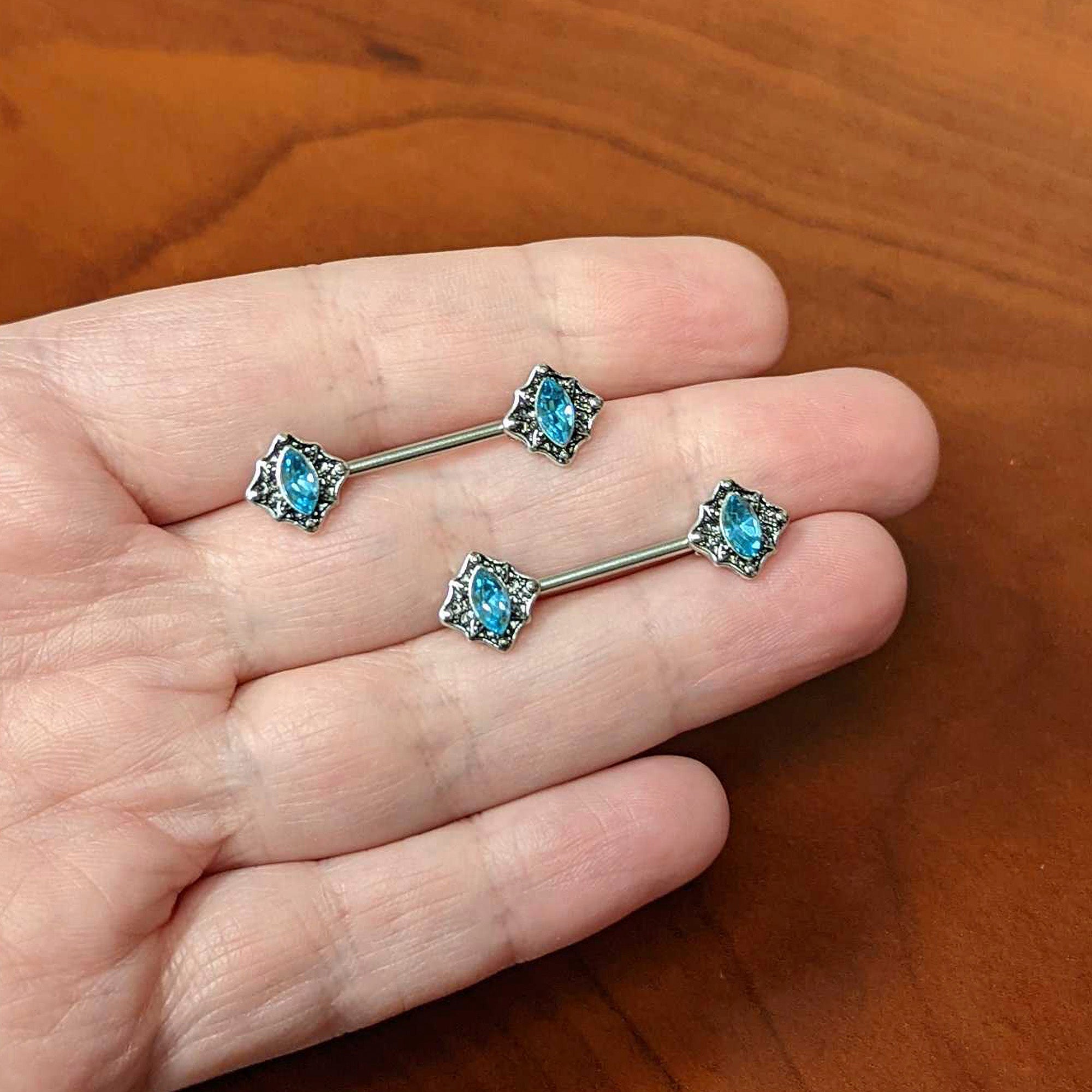 14G 9/16 Blue Gem Rhombus Retro Barbell Nipple Ring Set
