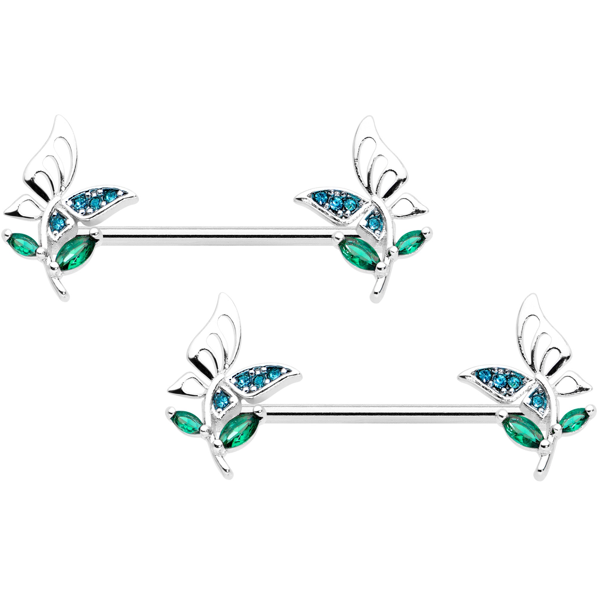 14G 9/16 Blue Green Gem Floral Butterfly Nipple Ring Set