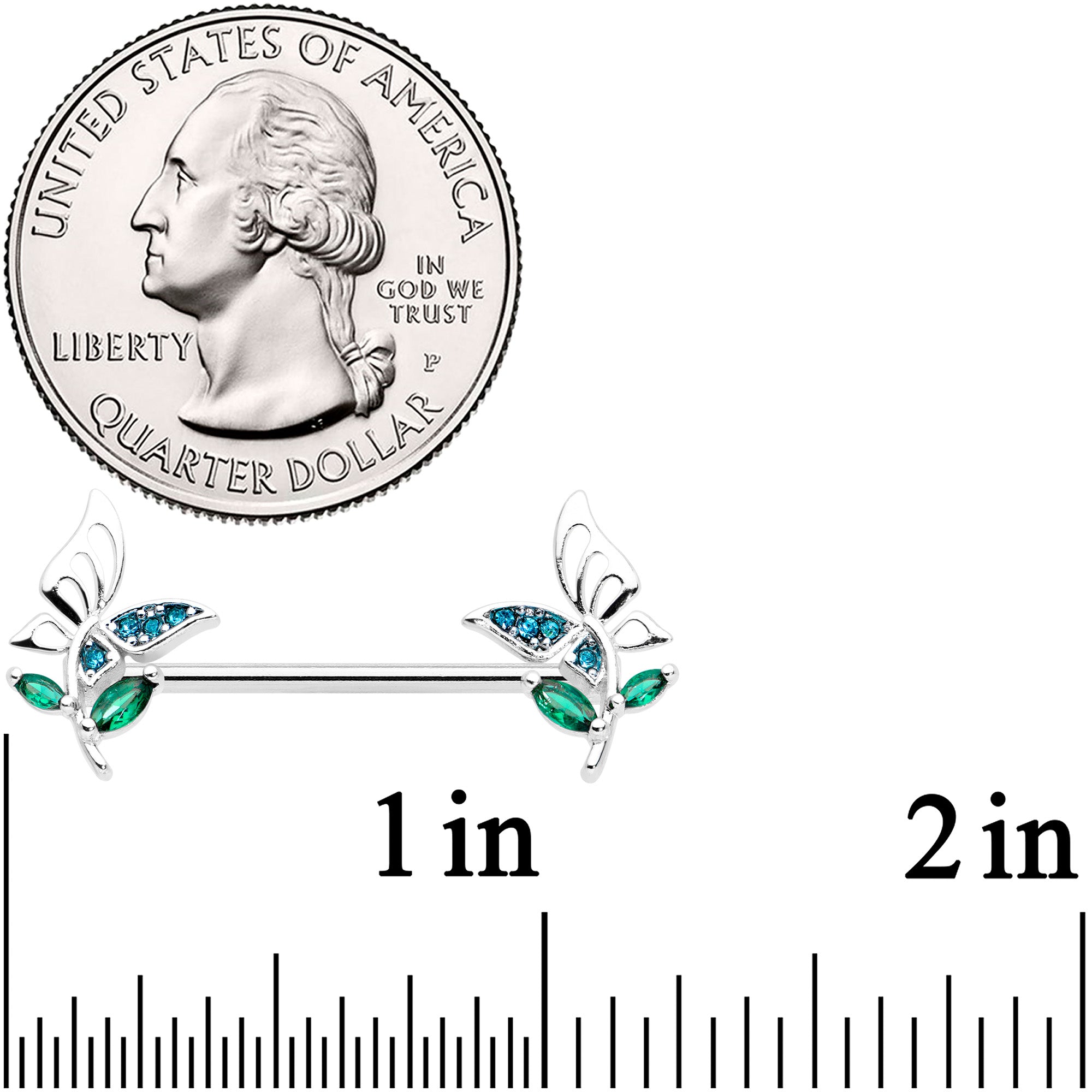 14 Gauge 9/16 Blue Green Gem Floral Butterfly Nipple Ring Set