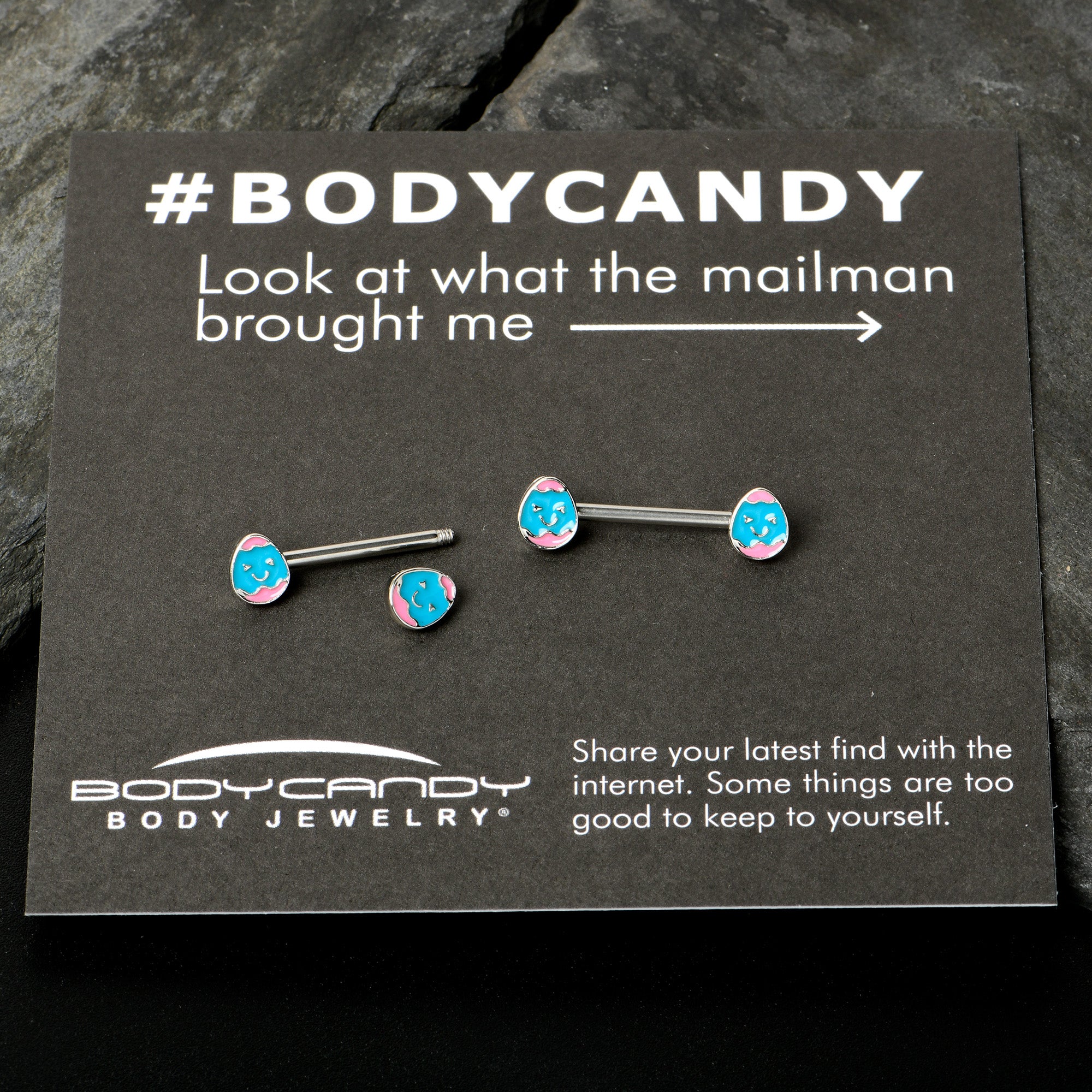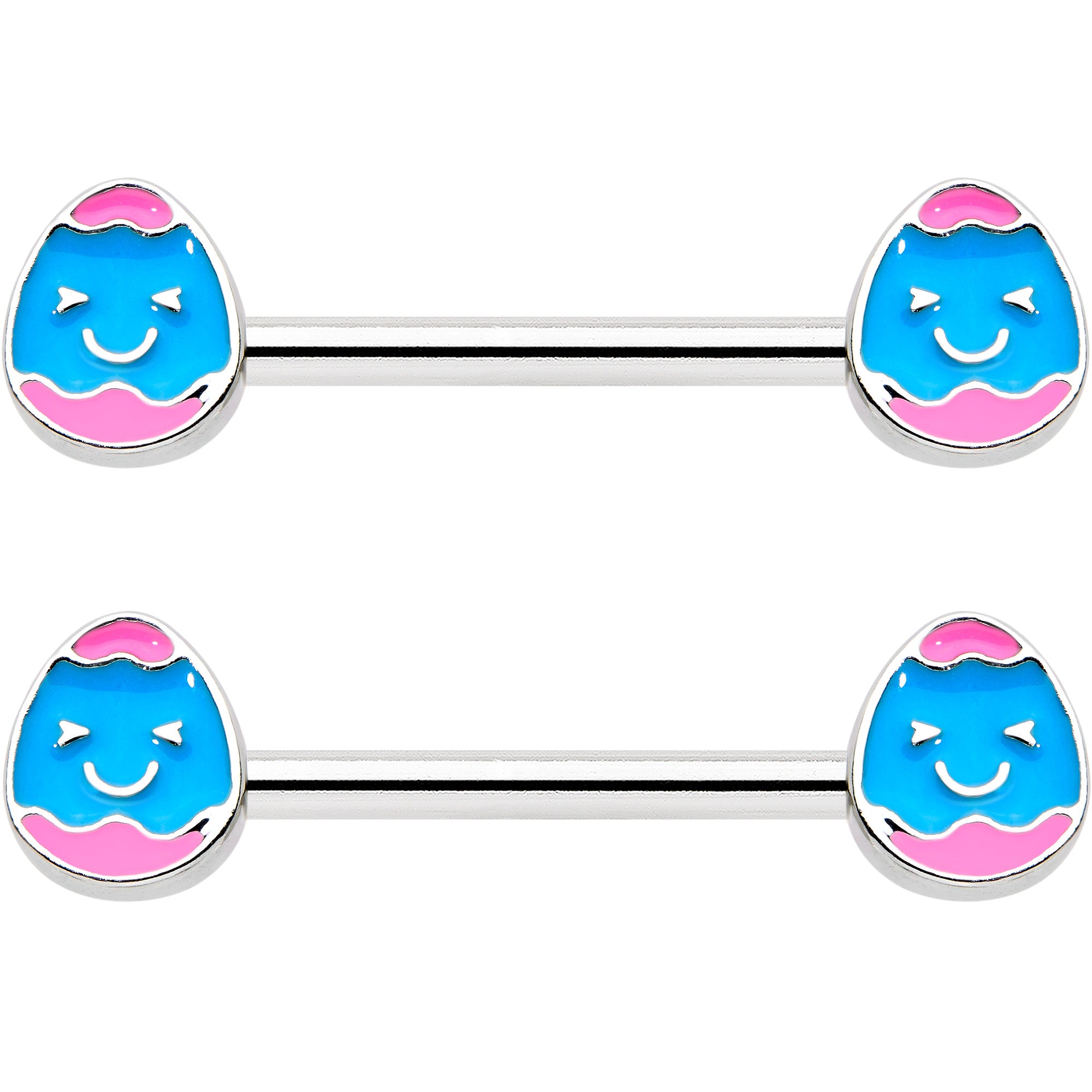 Get ready to hatch a new look for Easter with this 14 gauge nipple jewelry! It's made with 14mm durable 316L surgical grade stainless steel straight barbells. Each of the ends features a blue Easter egg charm, with a cheerful smiling face. The eggs are further embellished with pink ends for a festive touch of color. You won't have to hunt for kawaii style body jewelry for Easter when you're rocking these Easter egg nipple piercing rings! Sold as a set of two.