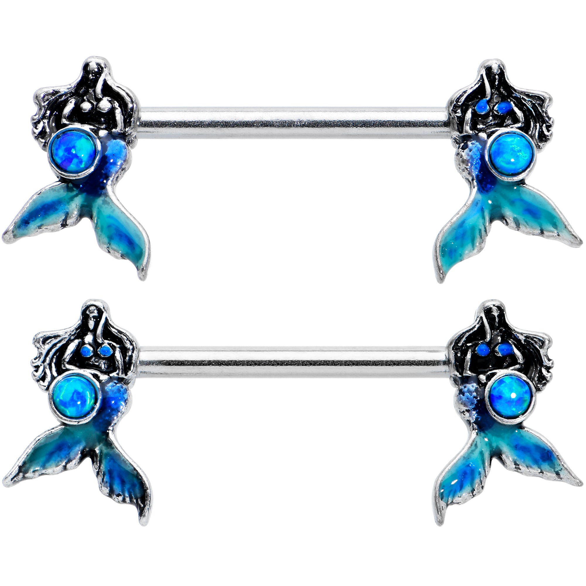The mermaids on this 14 gauge nipple jewelry have found some beautiful blue treasure! It's made with 14mm durable 316L surgical grade stainless steel straight barbells. Each of the ends features a mermaid charm with abstract, multi-dimensional features. The mermaid's tails are inlaid in blue and they're each set with a round blue synthetic opal - perhaps some undersea treasure? You'll be sure to treasure these nipple rings! Sold as a set of two.