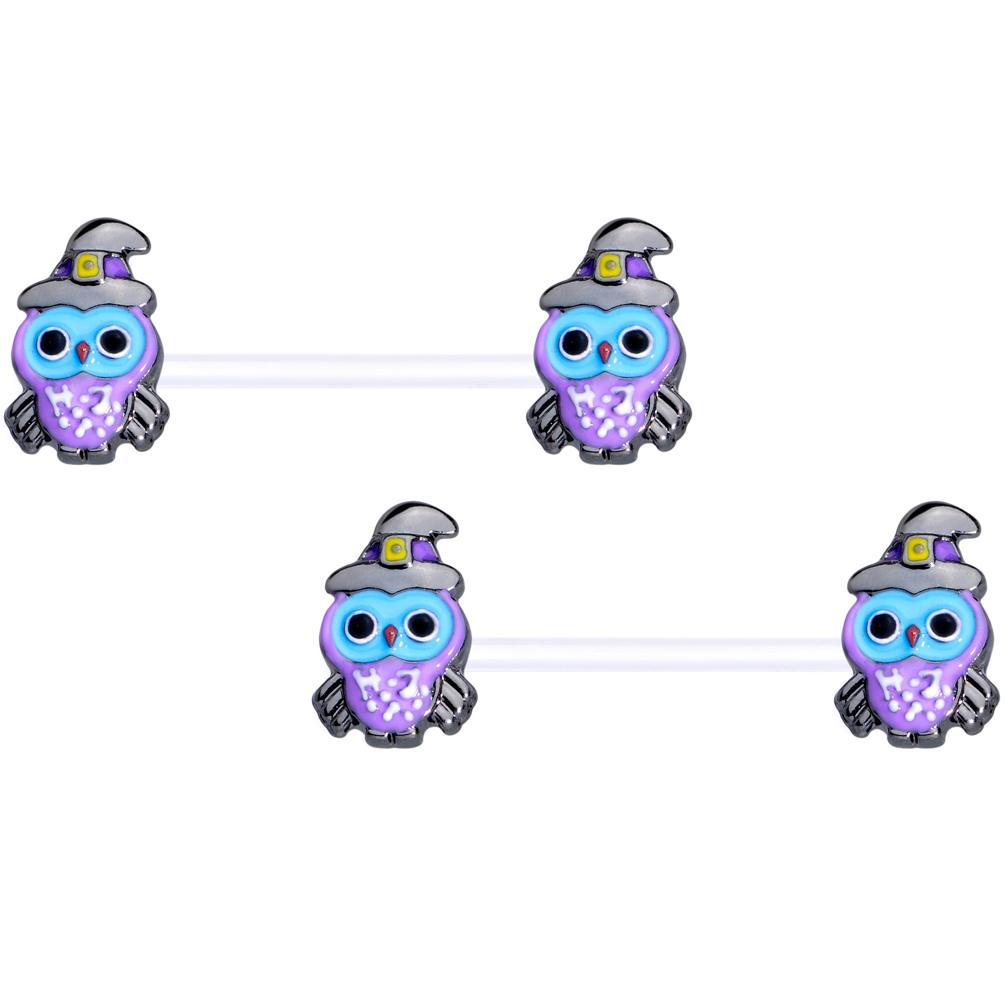 Are they magical owls or witches in disguise? You'll have to decide for yourself with this 14 gauge nipple jewelry! It's made with 14mm clear flexible Bioplast straight barbells. The ends feature purple and blue owl charms wearing gray witch hats with yellow buckles. These also work just as well for wearing during pregnancy as they do for Halloween! You'll want these birds to nest in your nipple piercings all year long. Sold as a set of two.