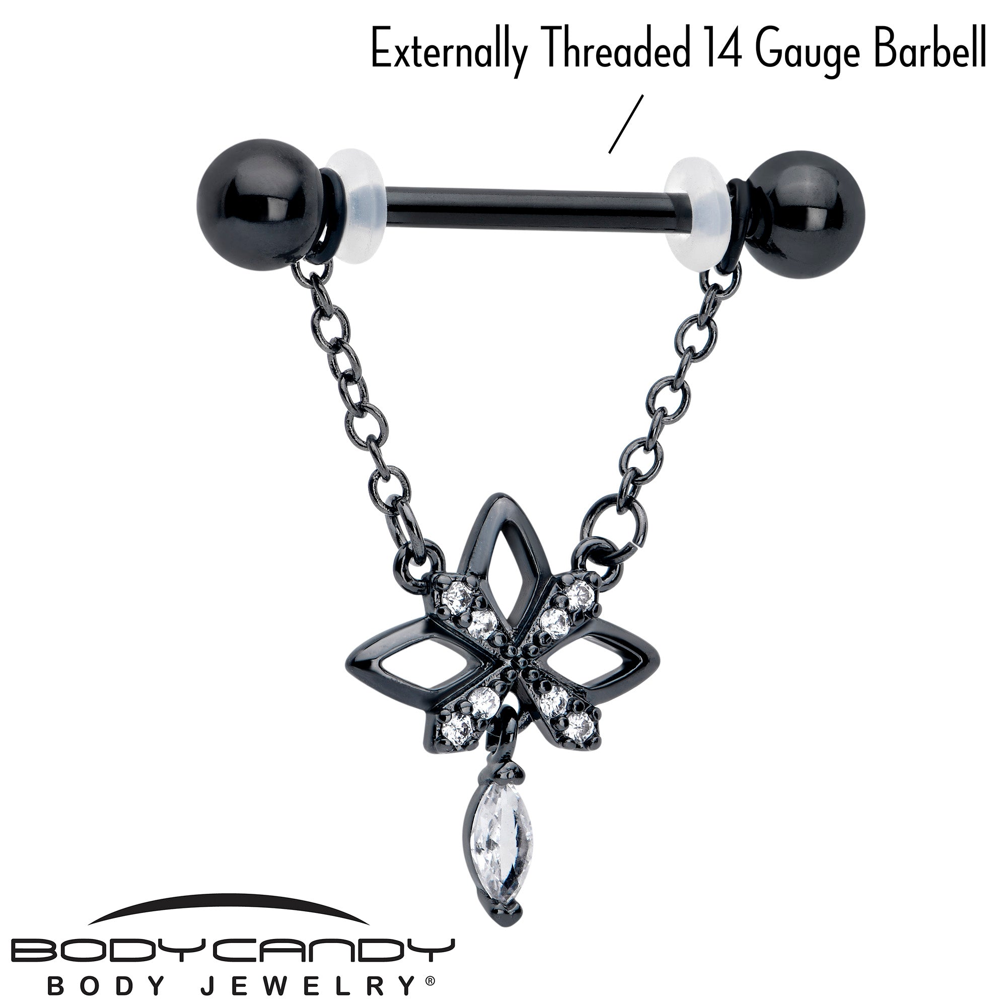 Fall in love with a goth new look, like on this 14 gauge nipple jewelry. It's made with 14mm black PVD over 316L surgical grade stainless steel straight barbells with 5mm ball ends. Each barbell features a double length of matching chain. Dangling from each set of chains is a star charm with an X over it, set with clear cubic zirconia gems along the legs. They are further embellished with matching clear cubic zirconia gem dangles for added style. Let your inner goth come out to play with these darkly divine nipple piercing rings. Sold as a set of two.