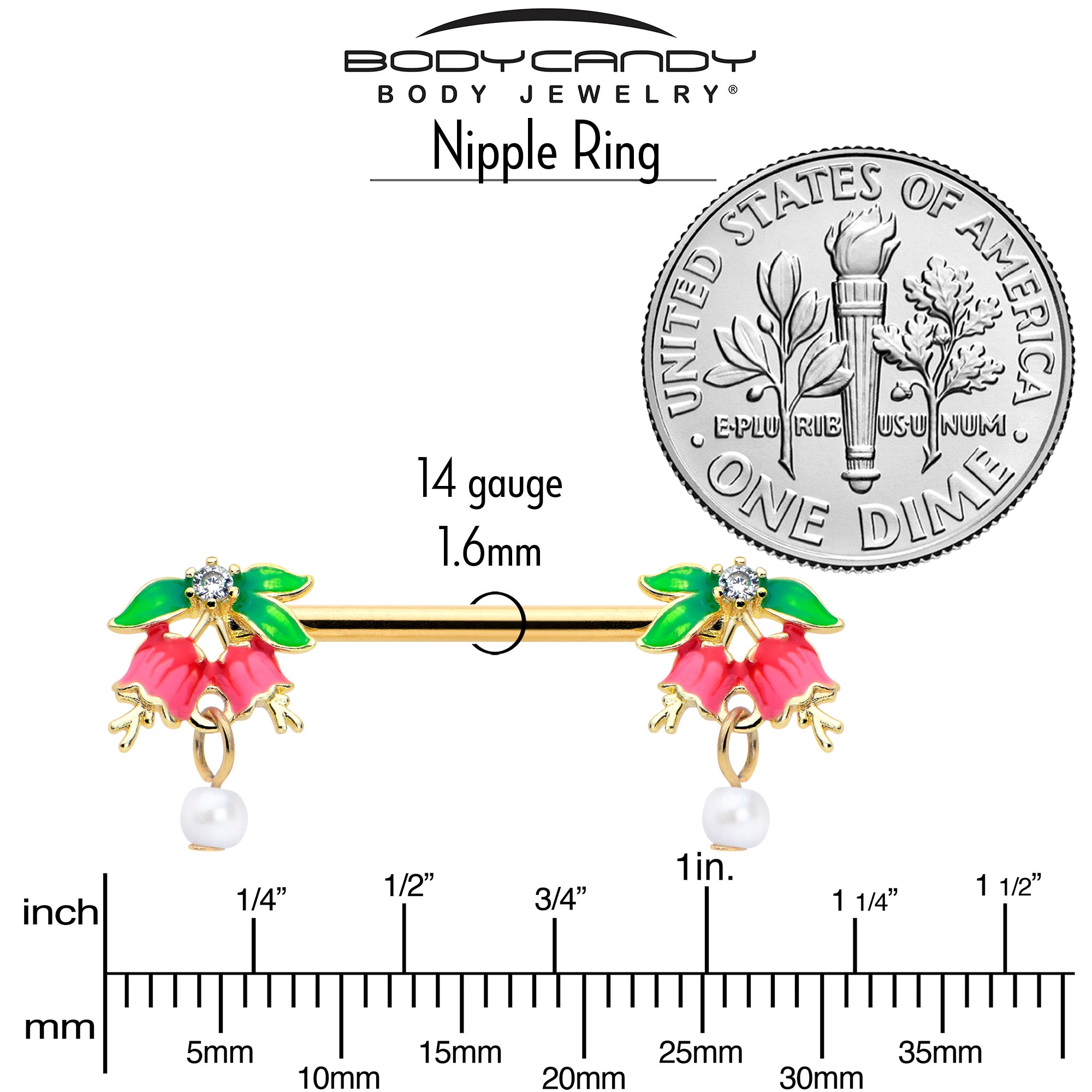 The flowers on this 14 gauge nipple jewelry are sure to ring your bell. It's made with 14mm gold tone PVD over 316L surgical grade stainless steel straight barbells. Each of the ends features a red and pink flowers charm with matching detailing. At the base of the flowers are trios of green leaves with clear cubic zirconia gems at the centers. Dangling from each pair of flowers is a faux pearl for added motion and style. You'll be ready to make some noise when you're rocking these fashionable, floral nipple piercing rings. Sold as a set of two.
