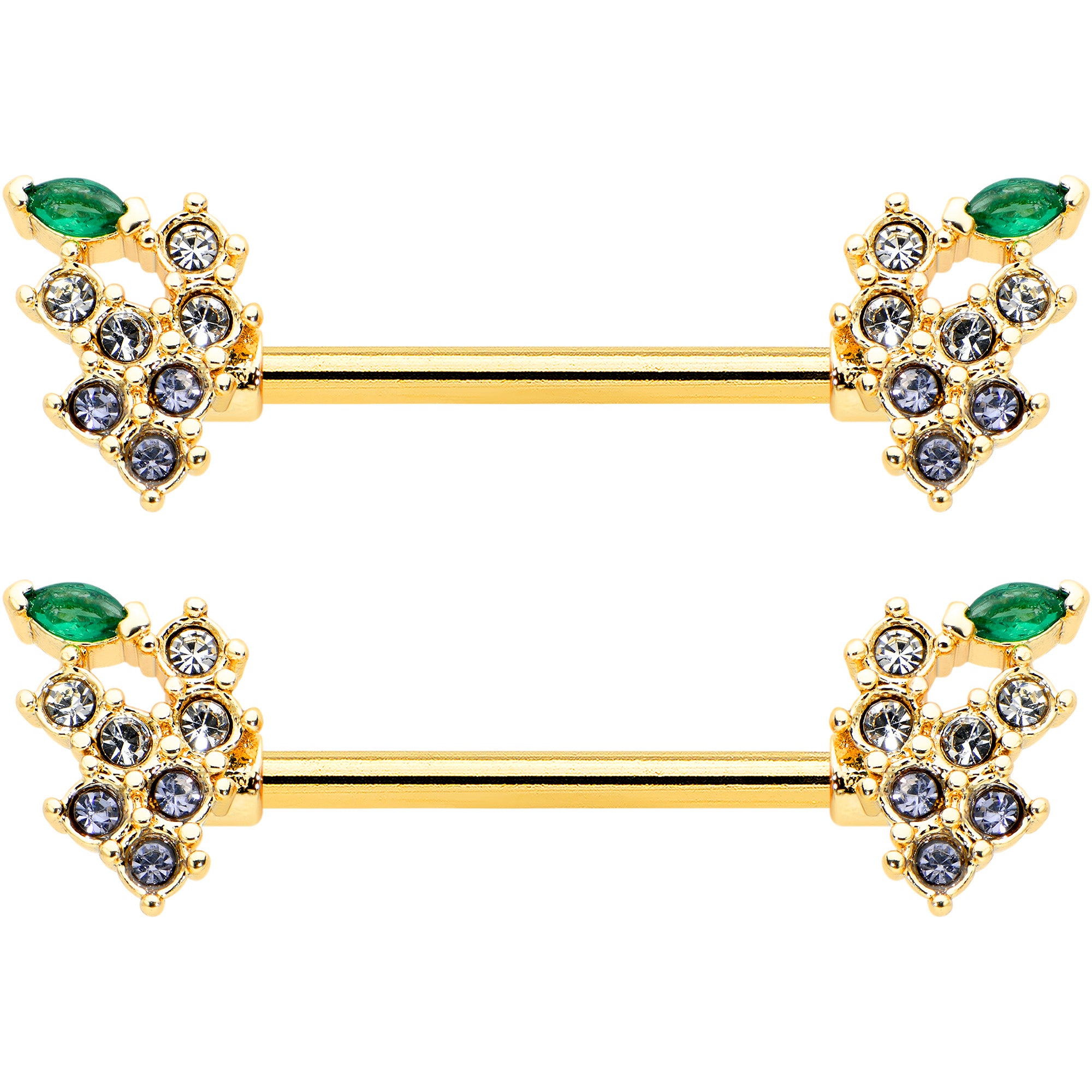 The delicious fruit on this 14 gauge nipple jewelry are one bunch you can't resist! It's made with 14mm gold tone PVD over 316L surgical grade stainless steel straight barbells. Each of the ends features a grapes charm, with purple gems and clear gems for fruit. The leaves are each composed of a single green gem for a striking color contrast. You'll be all set to wine and dine when you're rocking this gorgeous grape fruit nipple piercing jewelry. Sold as a set of two.