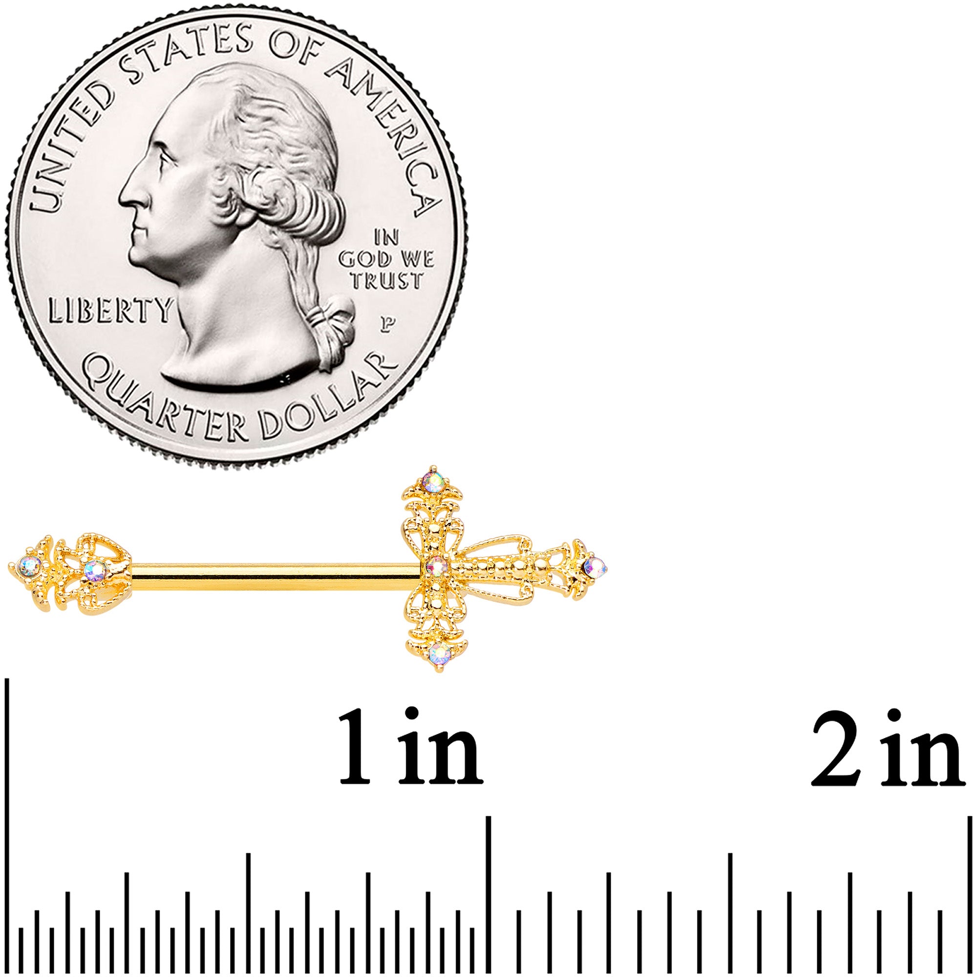 14 Gauge 9/16 Clear CZ Gem Gold Tone Scrolling Cross Nipple Ring Set