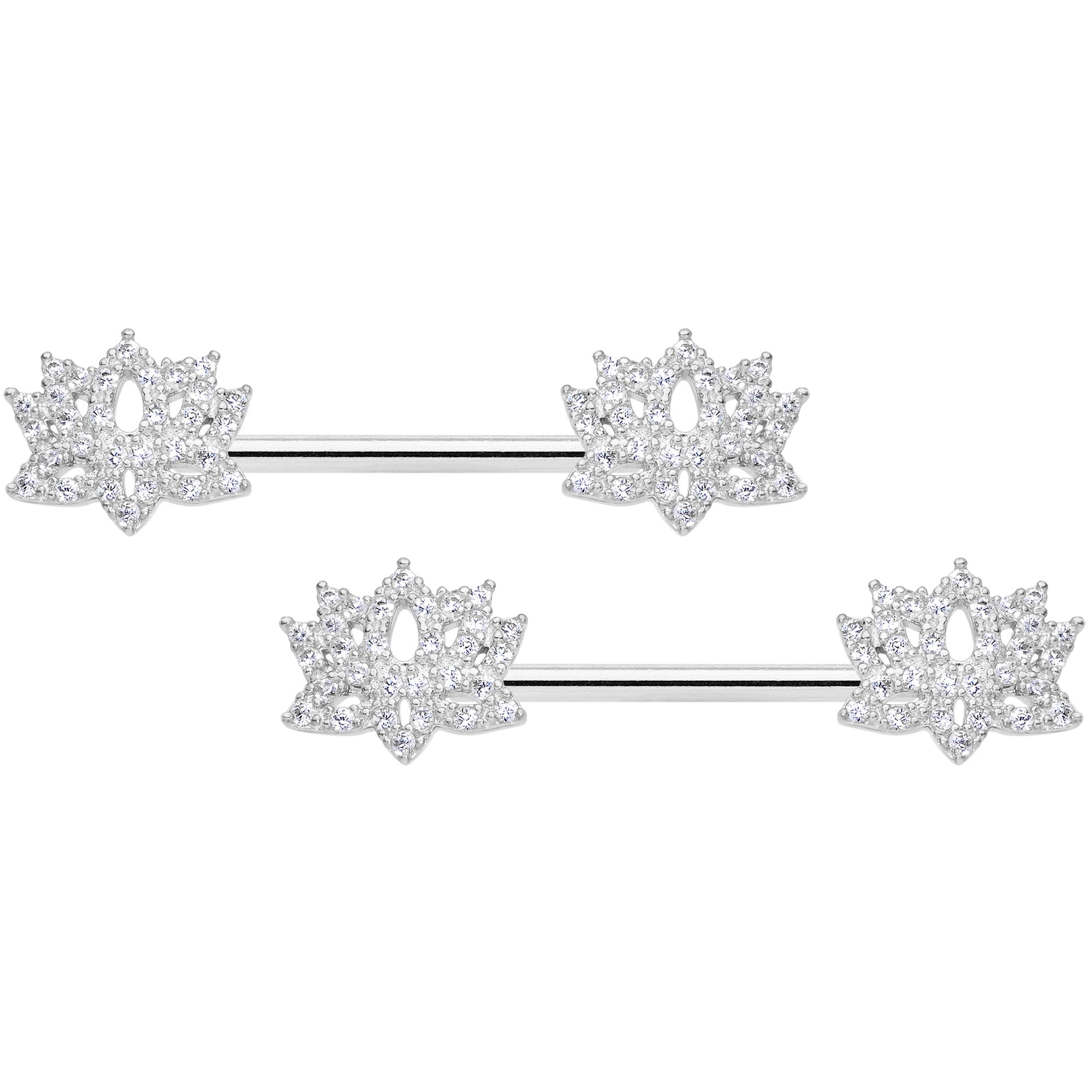14 Gauge 9/16 Clear CZ Gem Lotus Flower Nipple Ring Set