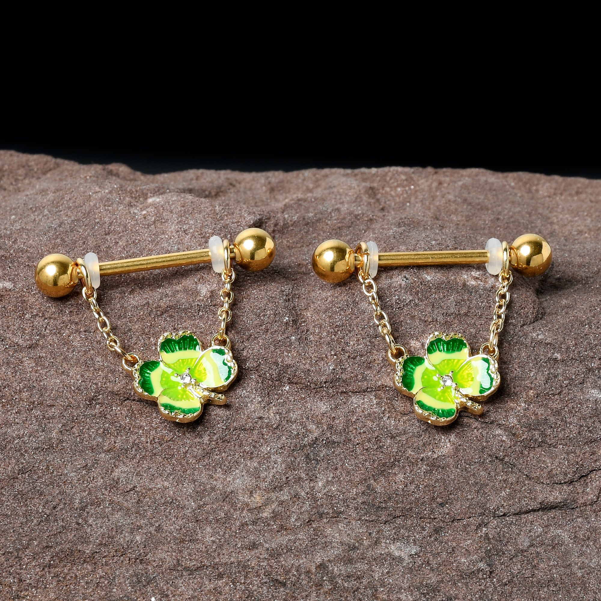 14 Gauge 9/16 Clear Gem Gold Hue Lucky Shamrock Dangle Nipple Ring Set