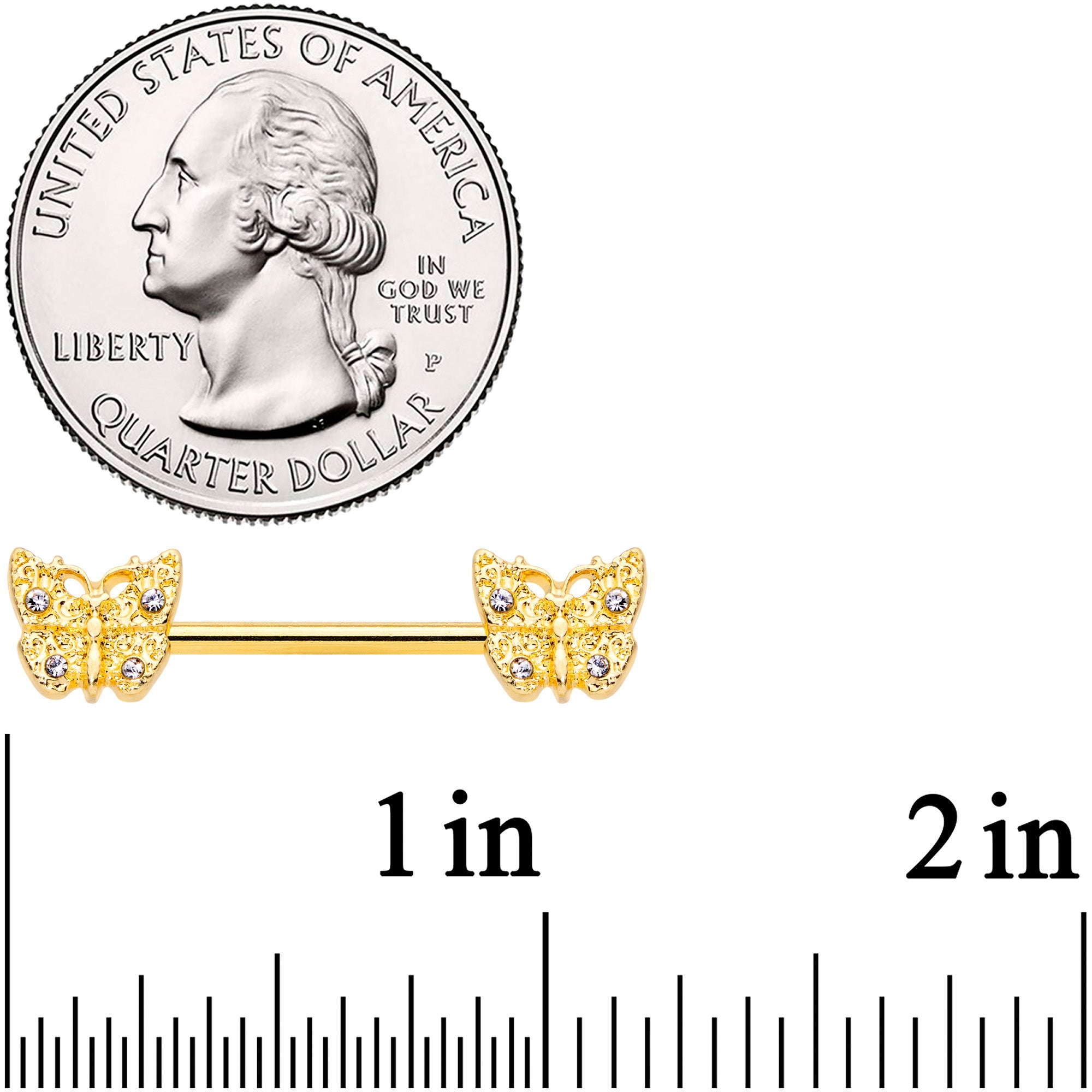 Get big style in a small package with this 14 gauge nipple jewelry! It's made with 14mm gold tone electroplated over 316L surgical grade stainless steel straight barbells. Each of the ends features a butterfly charm. The butterflies are set with small clear gems for an added touch of glamour. Go big with these beautiful little butterfly nipple piercing rings! Sold as a set of two.