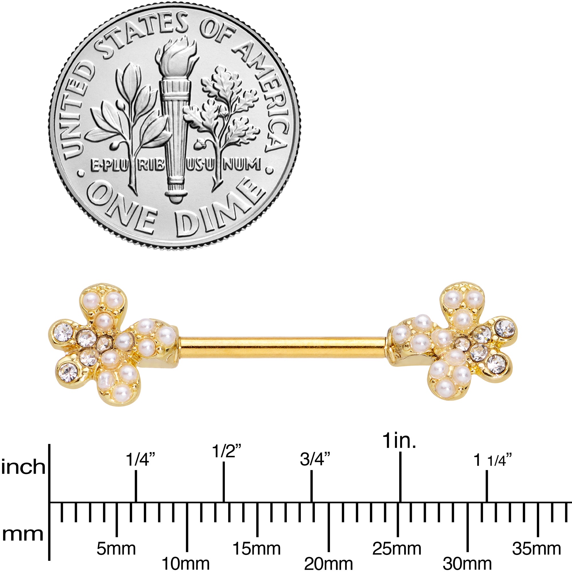 The splatter on this 14 gauge nipple jewelry is one you won't be in a hurry to mop up! It's made with 14mm gold tone PVD over 316L surgical grade stainless steel straight barbells. Each of the ends features a whimsical splat charm, set with white orbs on one side and with clear gems on the other. With their charming shape, luxe detailing, and clever design, these are some splats that are sure to suit any style! Sold as a set of two.