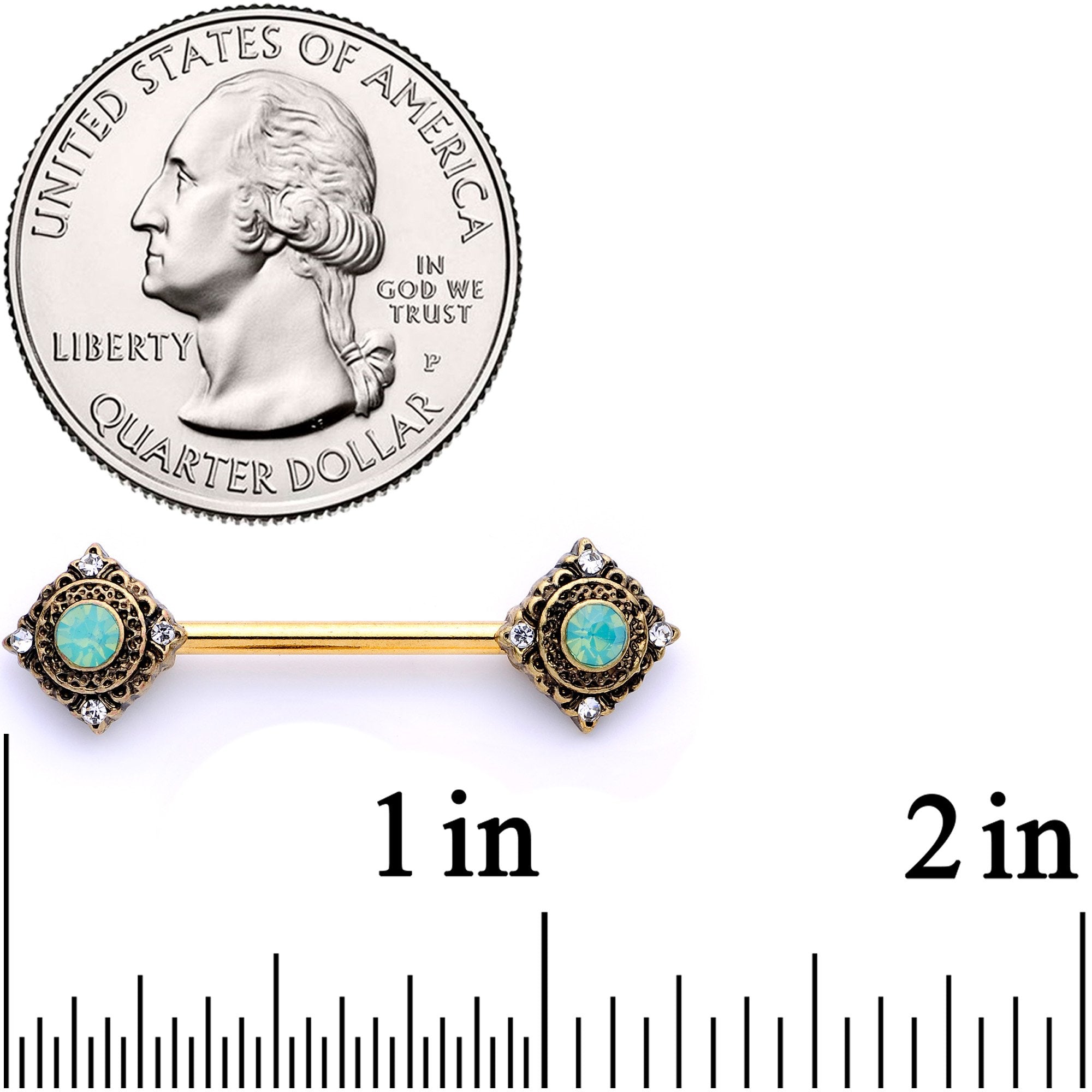 These 14 gauge nipple piercings give antique, art deco styling to some thoroughly modern jewelry! Made with 14mm gold tone PVD over 316L surgical grade stainless steel straight barbells, they feature rhombus shaped ends. The ends are finely textured with precision detailing, embellished with tiny clear gems at the corners. The icing on the cake is the green faux opal at the center of the rhombus, giving it a very real heirloom appearance without the heirloom price. If you're dreaming of a bygone era that still included nipple piercings, this nipple jewelry will take you there! Sold as a pair.
