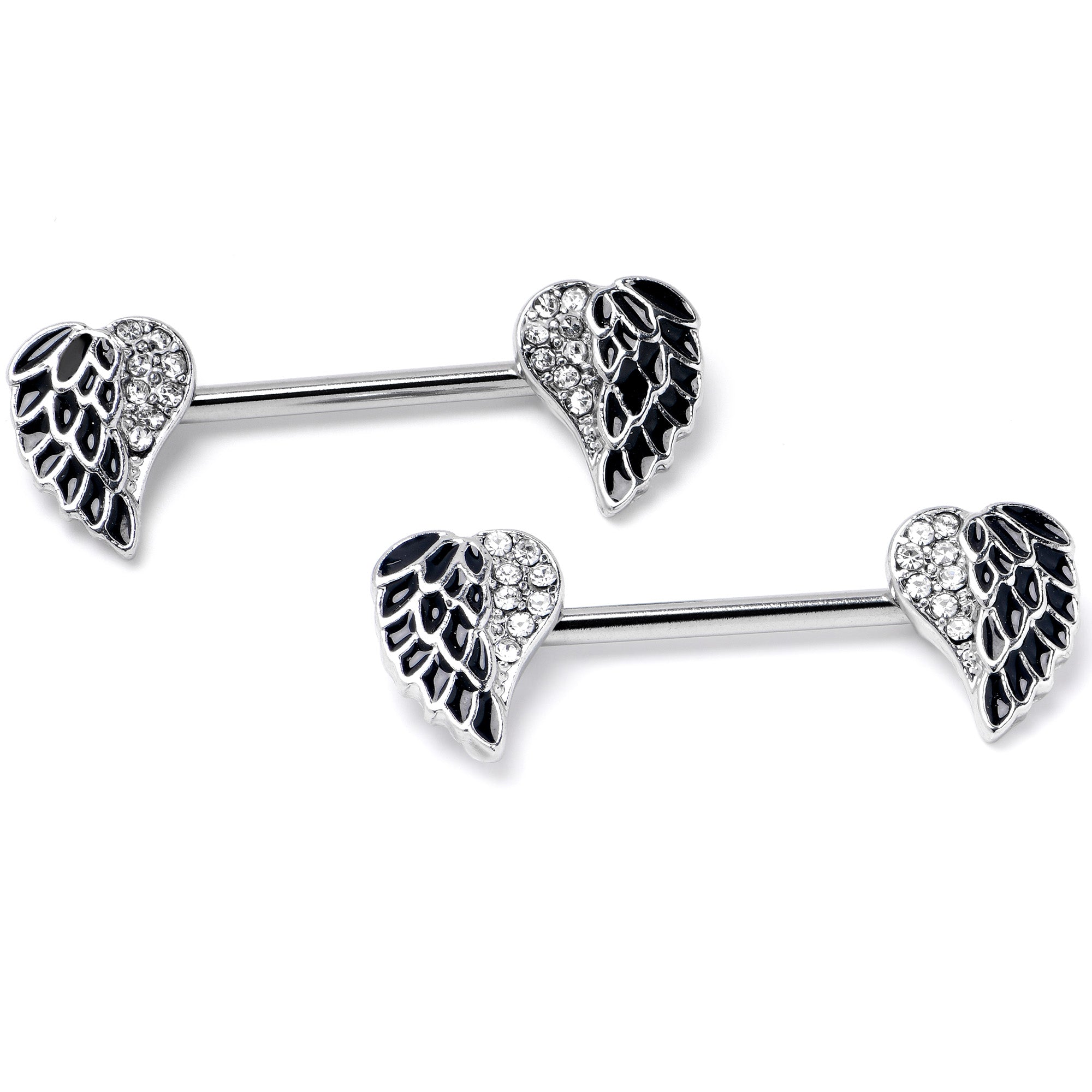 Give yourself a heavenly new look with this 14 gauge nipple jewelry. It's made with 14mm durable 316L surgical grade stainless steel straight barbells. Each of the ends features a heart shaped charm featuring an angel's wings, with one side paved with clear gems. The other sides feature black inlay and simply styled feather details. Let your look and your spirit soar with these stylish and spiritual nipple piercing rings. Sold as a set of two.