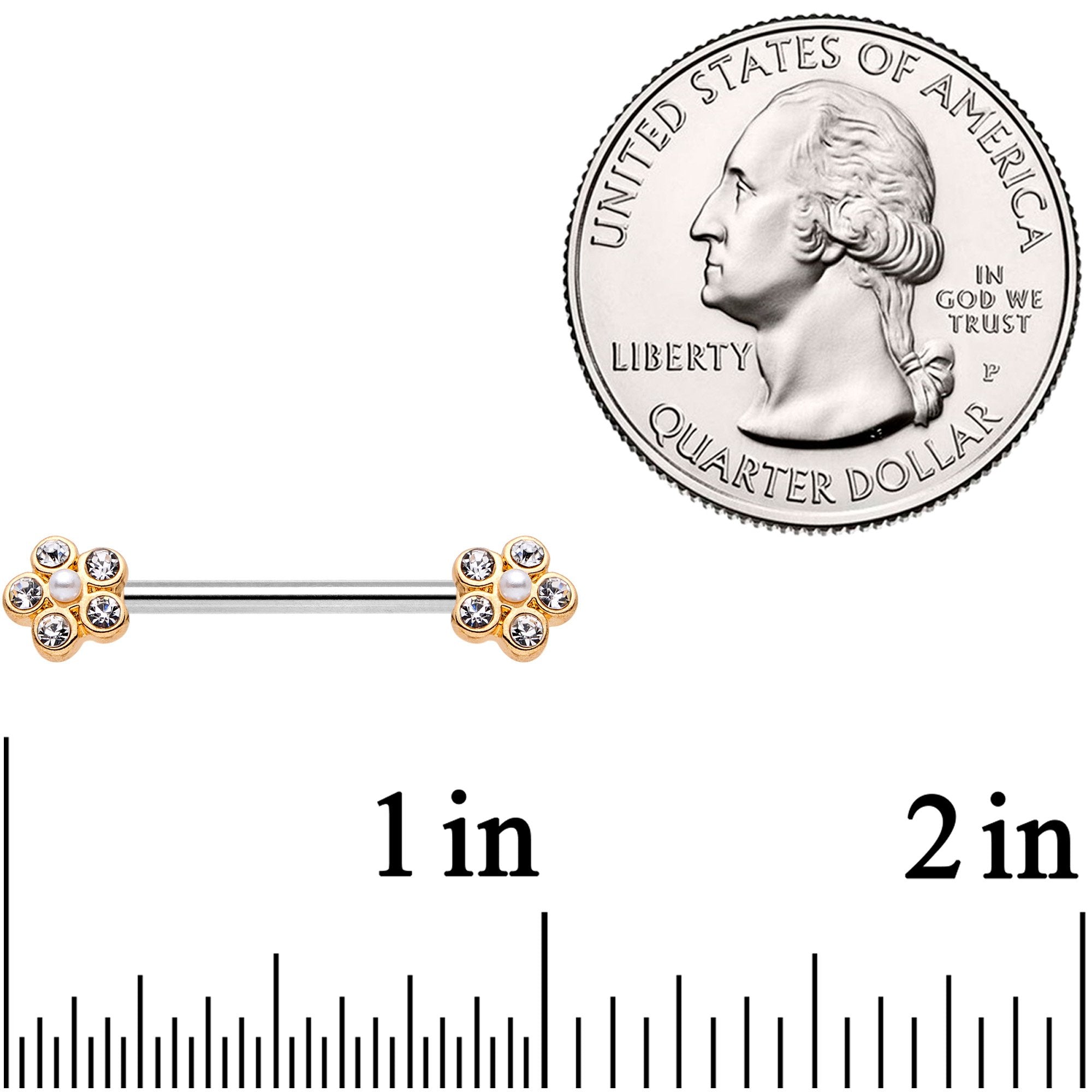 Flowers are nice and so are gems, but both together is the best of all! These nipple barbells are 14 gauge and made with durable 316L surgical grade stainless steel straight barbells. They are tipped with gold tone flowers, made of rich clear gems and capped with a luscious white orb in the center. At 14mm they are the perfect size for you to wear flowers on you every place you go! Sold as a set of two.